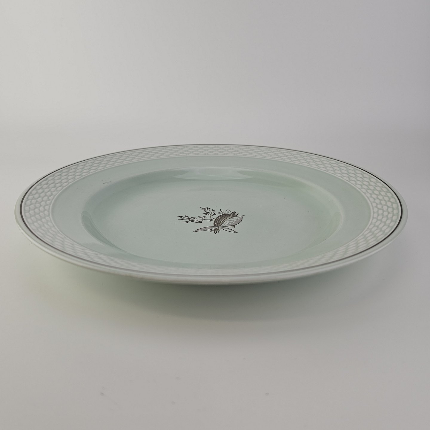 Stel i lysegrøn fajance med natur dekoration og flettet kant
