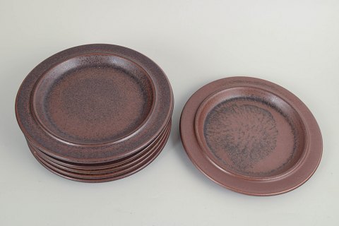 Sæt bestående af seks salattallerkener i stentøj fra Ruska-serien hos Arabia, udført med den karakteristiske, melerede brune glasur i varme jordtoner. Klassisk cirkulær form med let forhøjet fane og levende glasuroverflade, hvor naturlige variationer giver hvert stykke et individuelt udtryk.