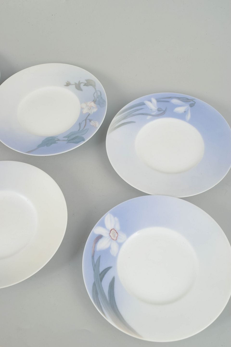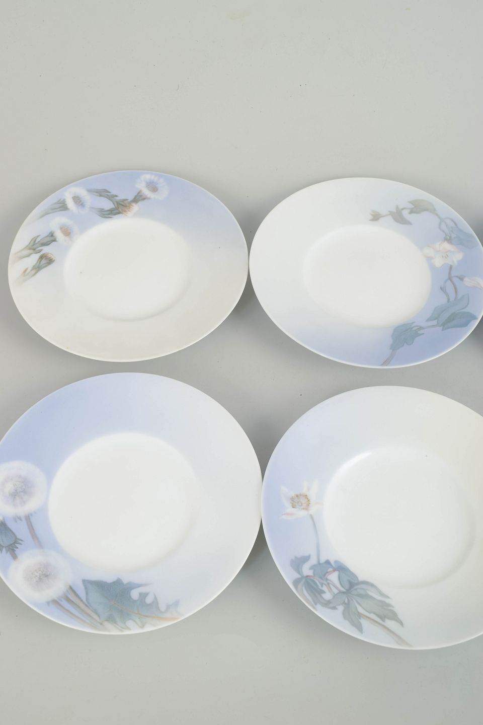 Sæt bestående af seks tallerkener i glaseret porcelæn med håndmalet underglasurdekoration i Art Nouveau-stil med stiliserede blomster- og bladmotor i afdæmpede blå og grønne nuancer. Udført efter Royal Copenhagens model 12/1910. Eksemplarerne er annullerede og mærket med én indridsede streg under bunden.