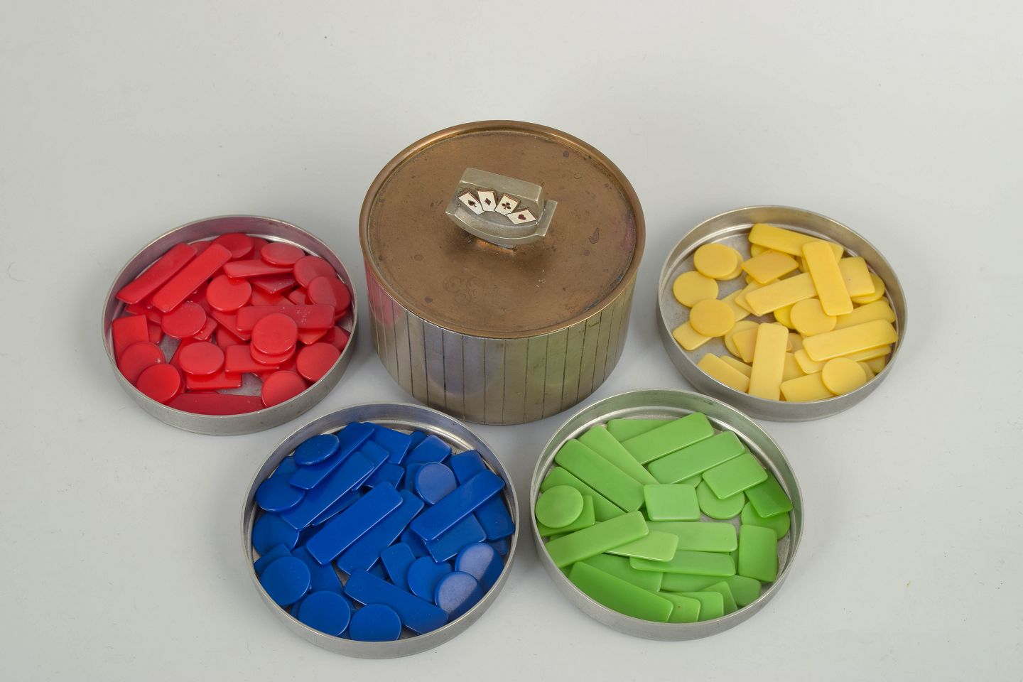 Art deco lågbeholder udført i tin med emaljerede spillekort i flere farver. Signeret GAB, Sverige, og fremstår som et komplet sæt.