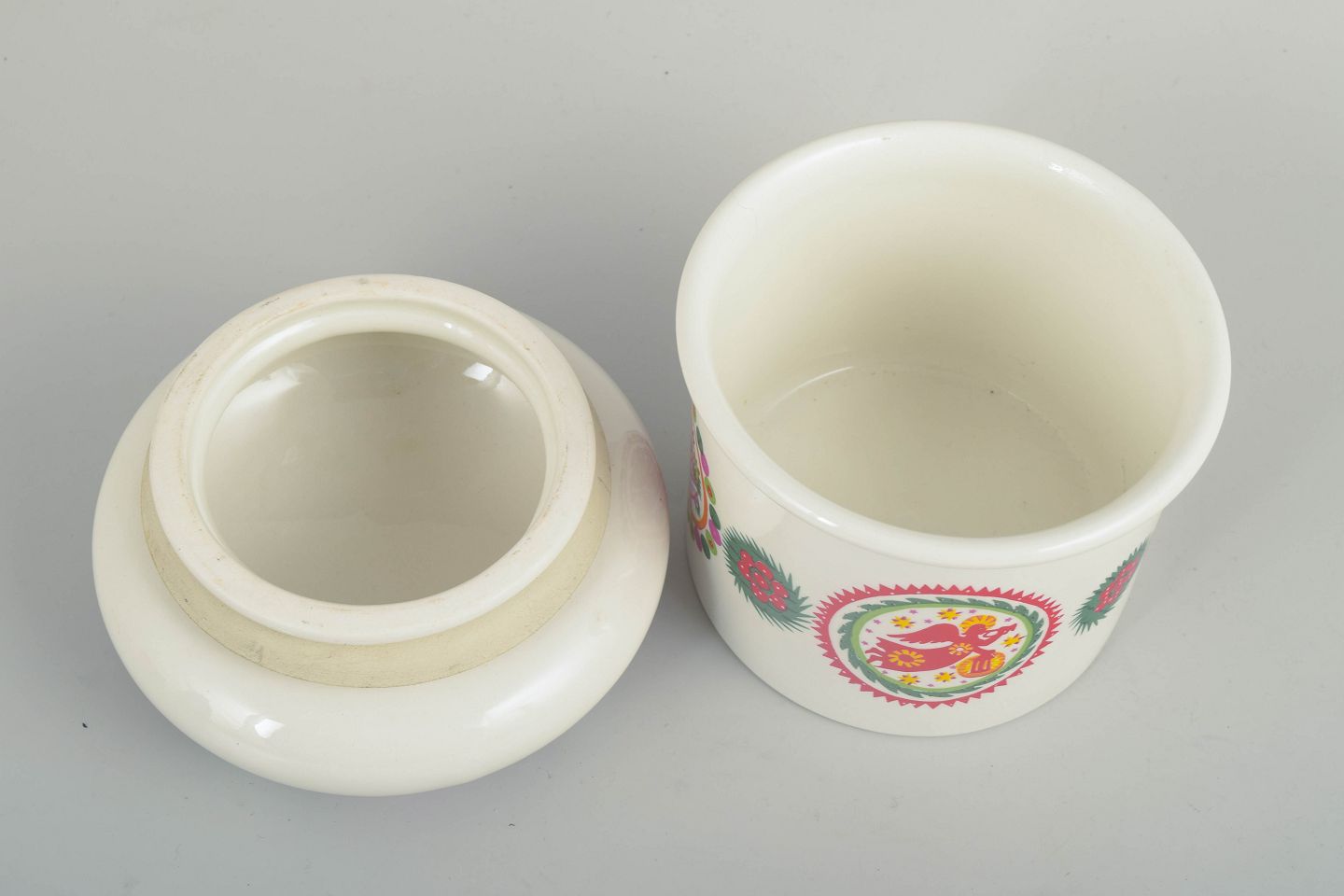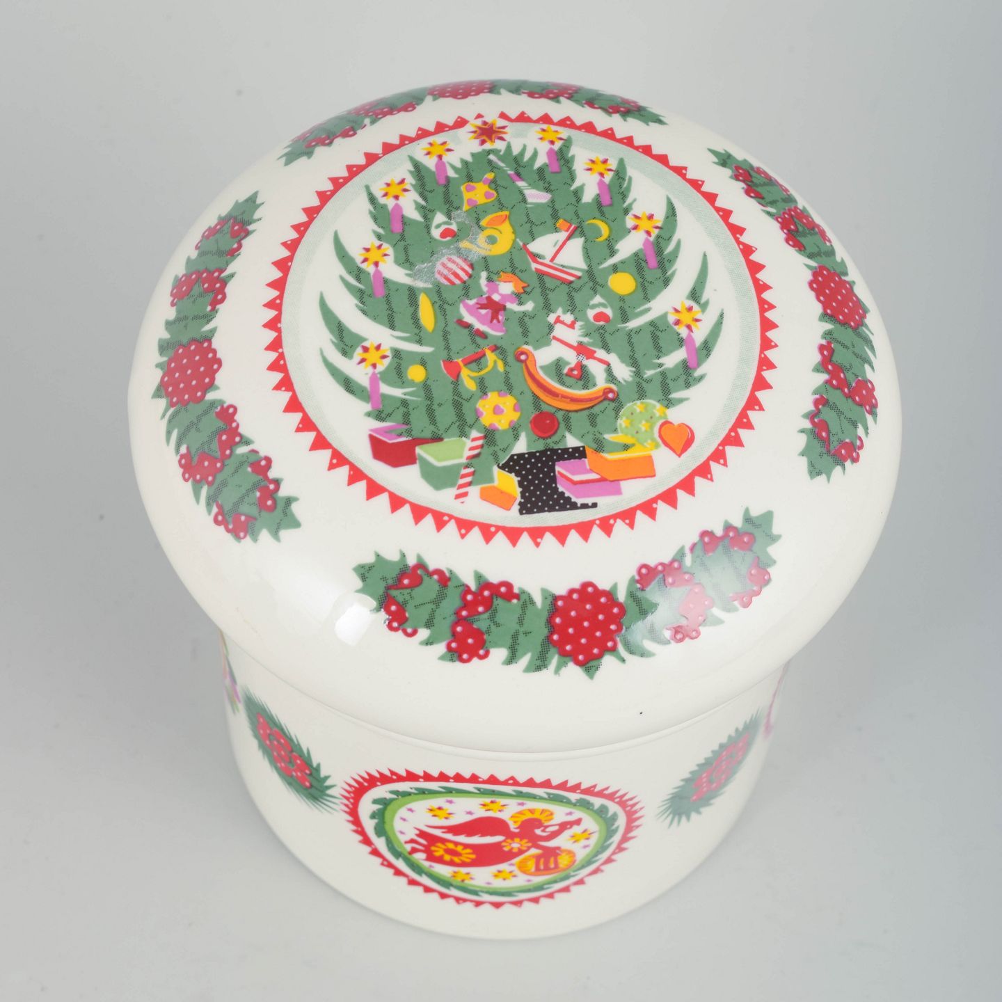 Cylindrisk lågkrukke i fajance med farverig juledekoration i rød-, grøn- og gule toner på lys bund. Dekoreret med stiliserede julemotiver, herunder engel- og blomsterornamentik i cirkulære medaljoner, samt krans- og kristtornborter. Låget har let hvælvet form med gennemgående dekoration, der matcher krukkens sider.