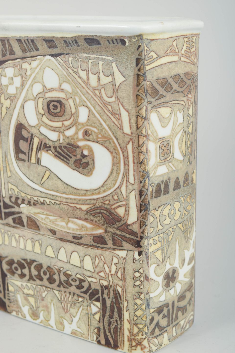 Rektangulær vase i fajance med reliefdekorerede felter og karakteristisk geometrisk ornamentik i afdæmpede jordfarver og lyse kontraster. Vasen er udført i Nils Thorssons velkendte formsprog fra Baca-serien, med tydelig inspiration fra arkæologiske og grafiske motiver. Overfladen har en markant taktil struktur, hvor dekorationen er integreret i formen og skaber et harmonisk helhedsudtryk. Model 719/2942.
