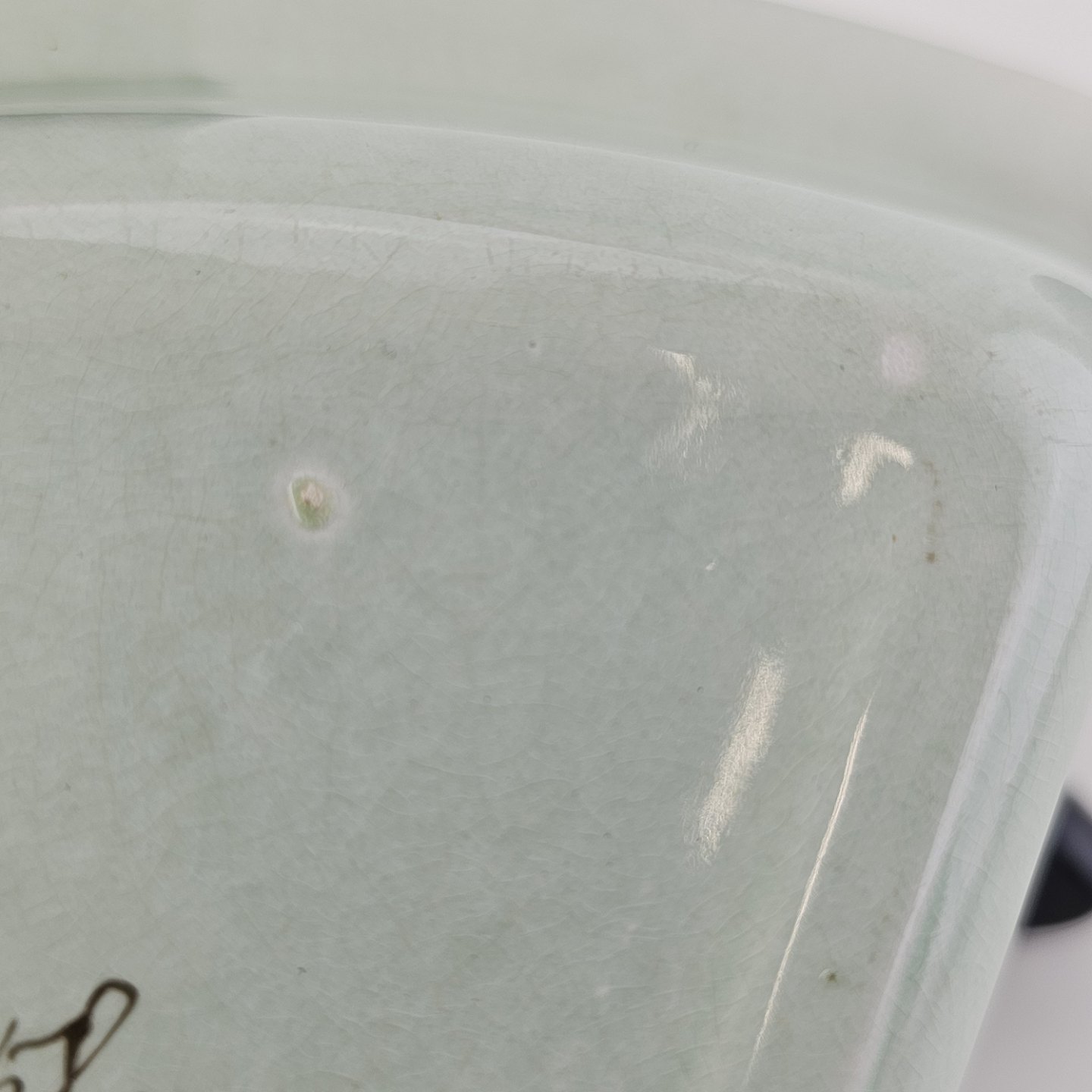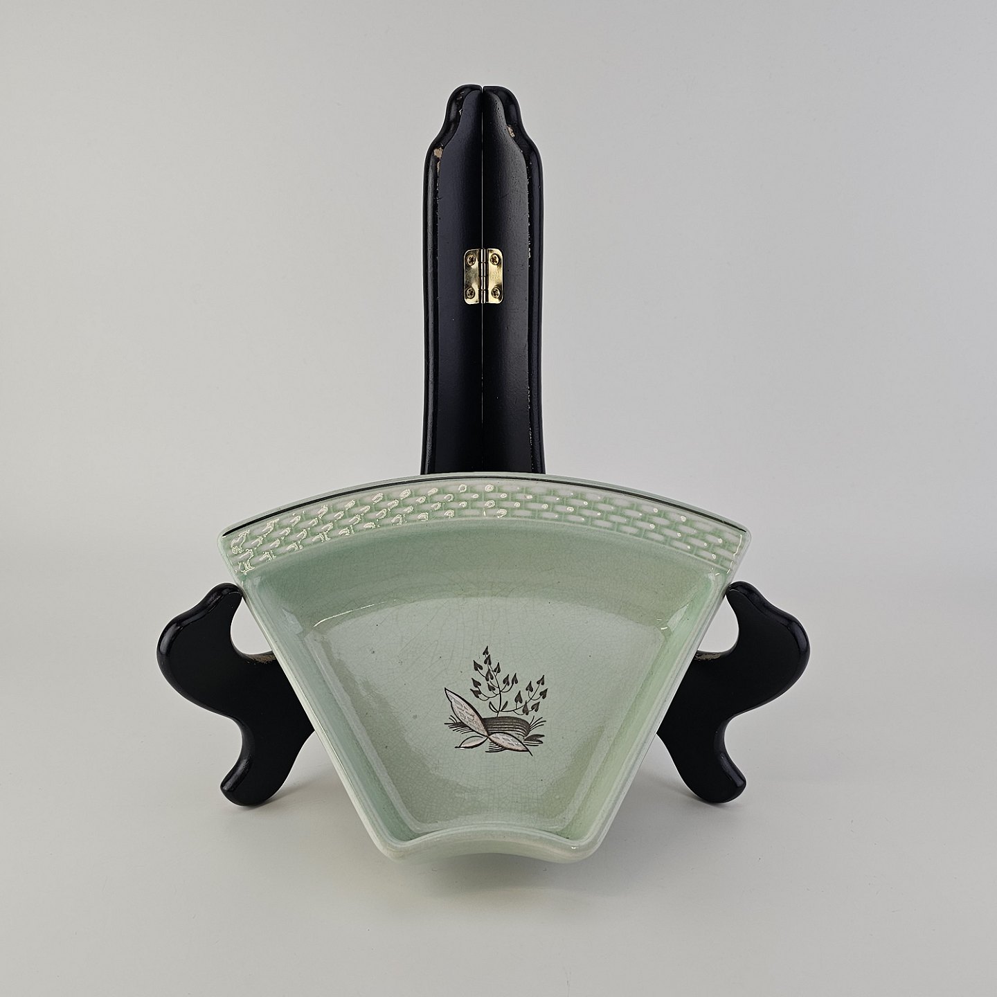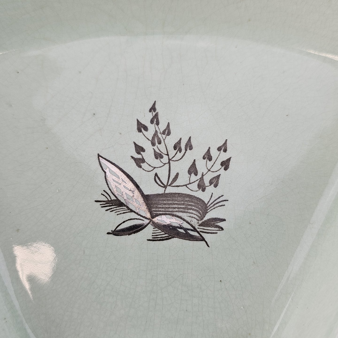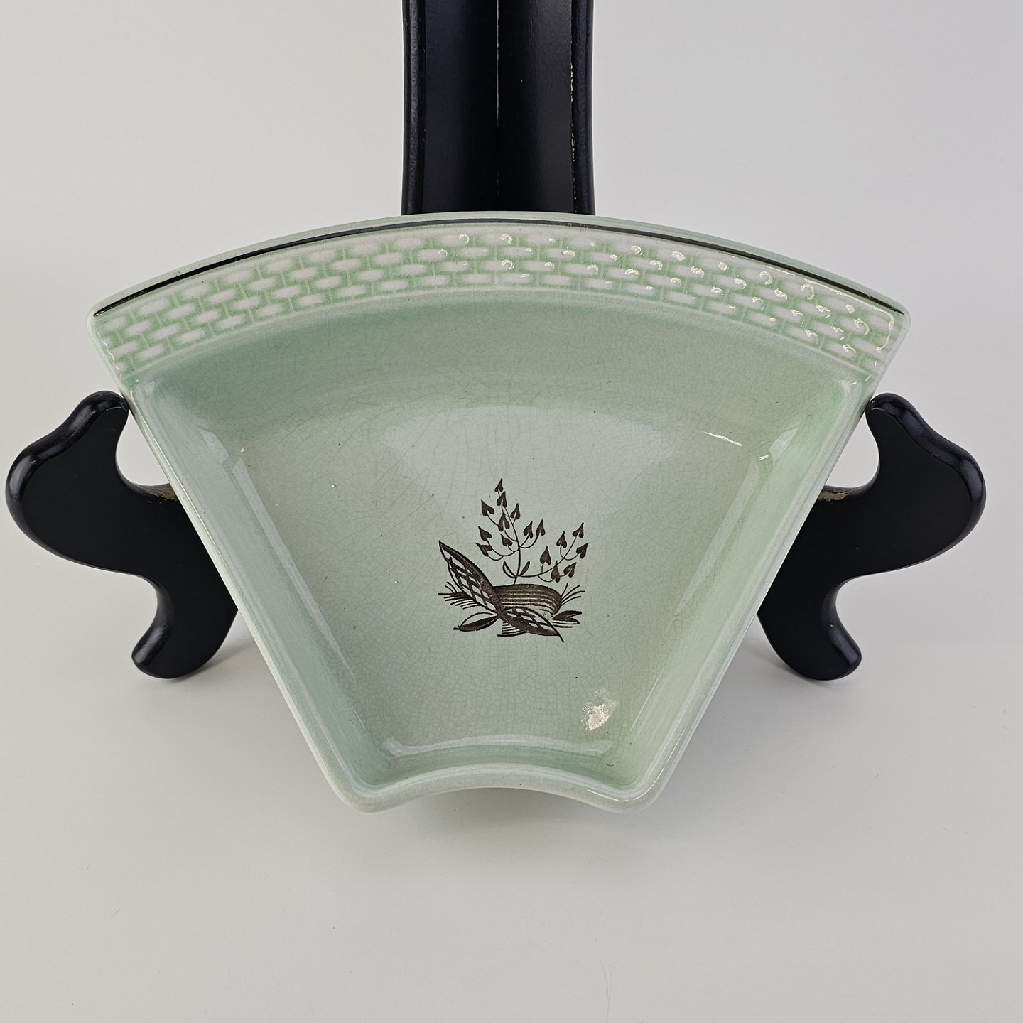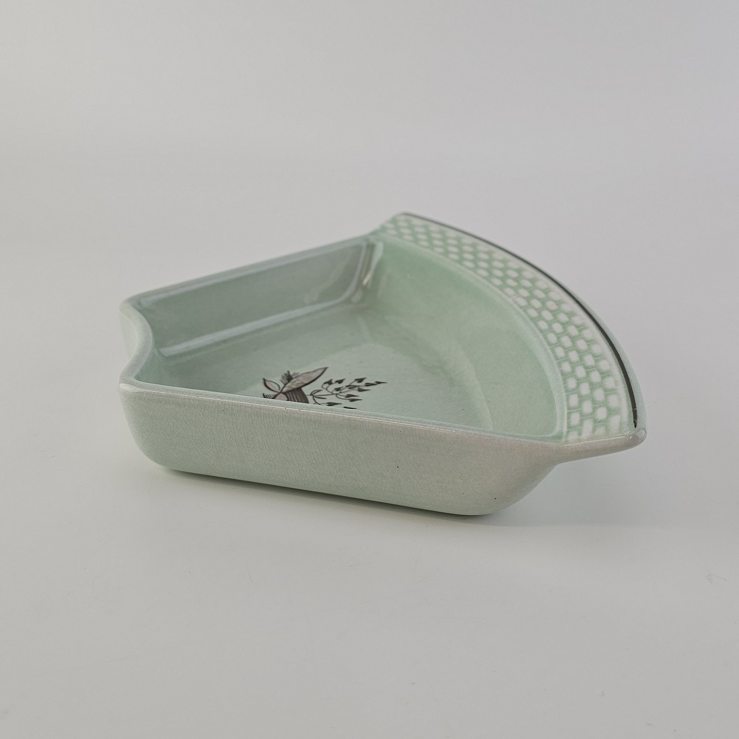 Stel i lysegrøn fajance med natur dekoration og flettet kant