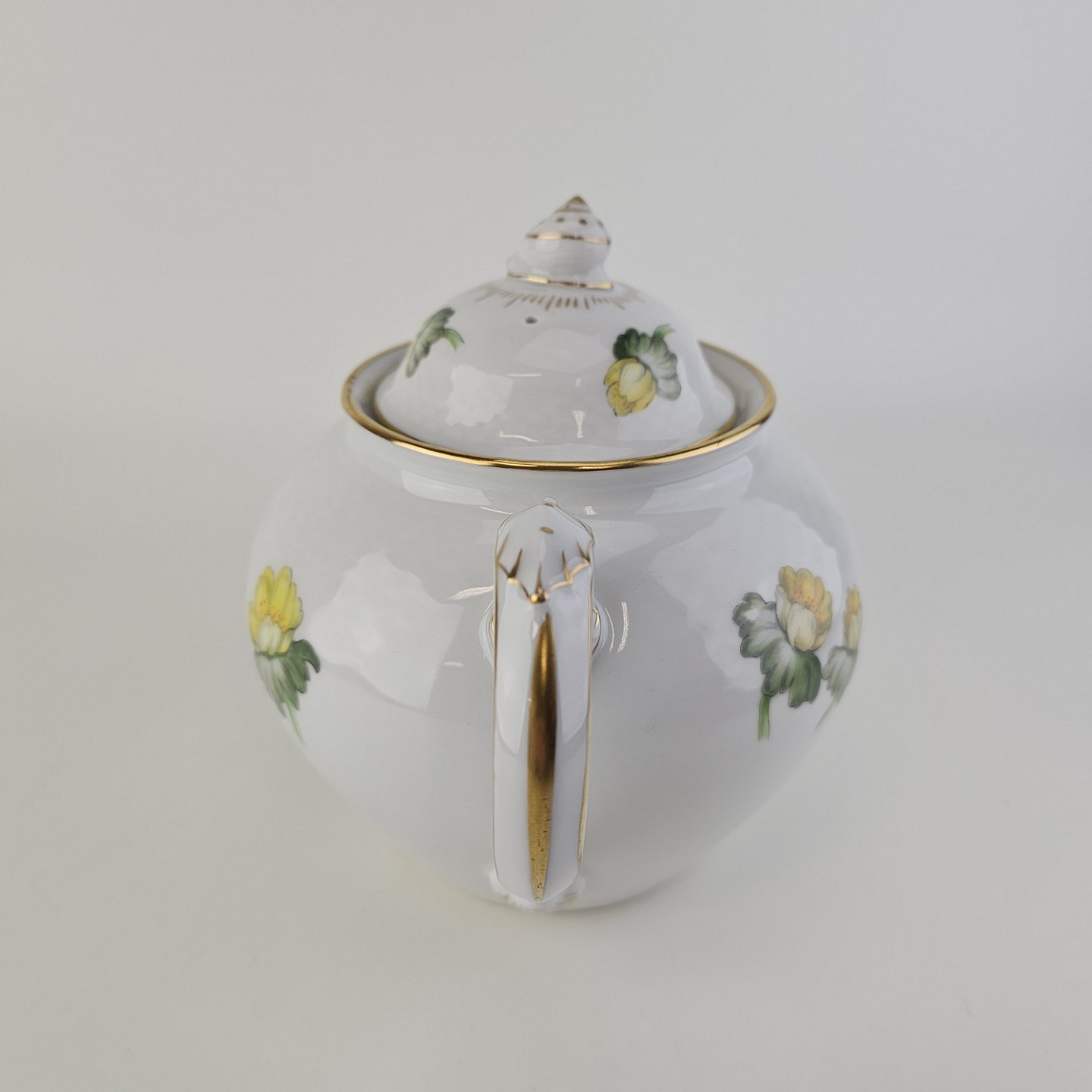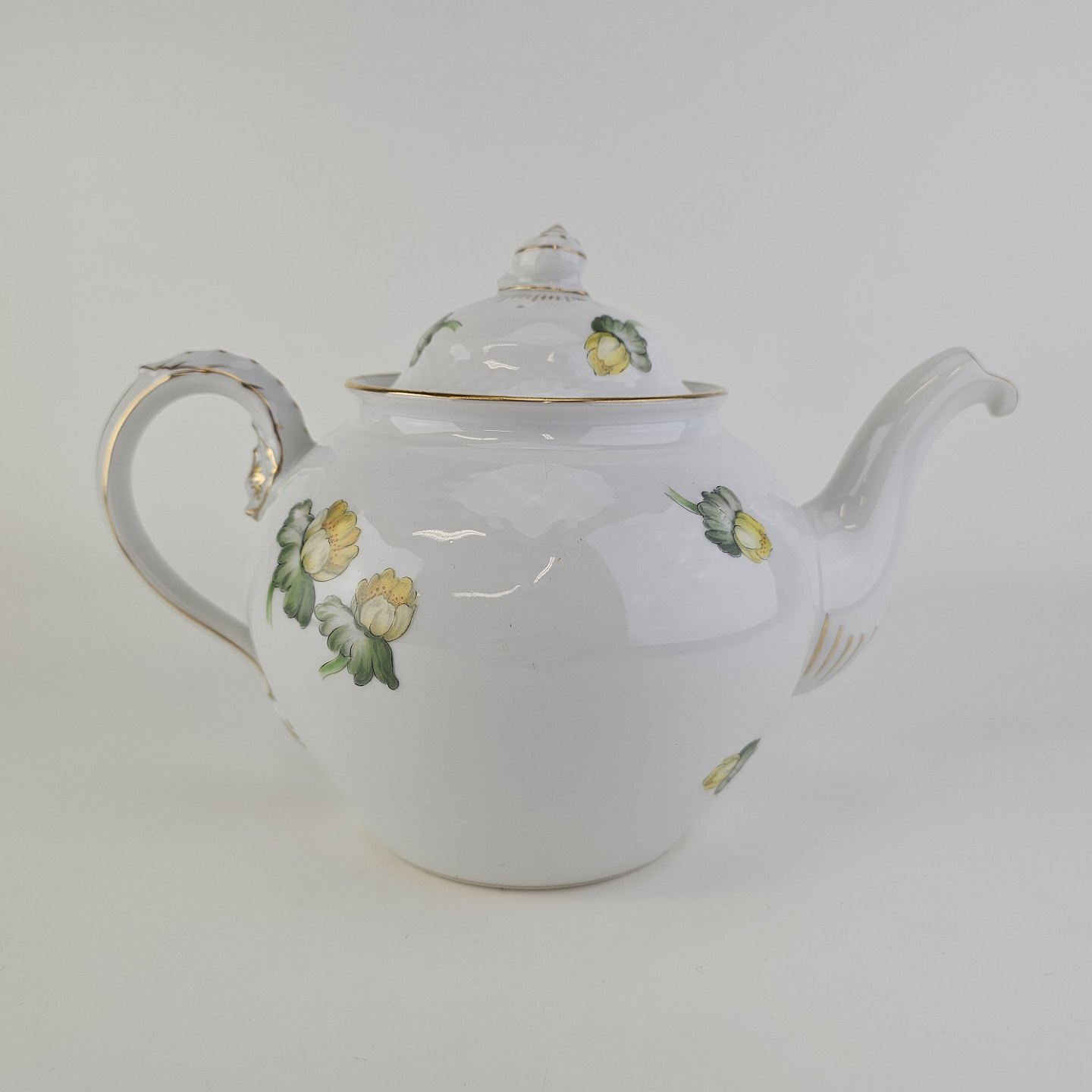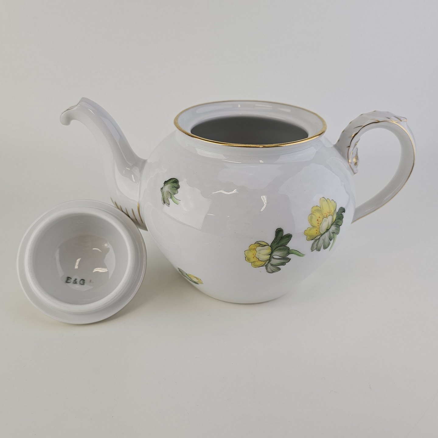 Hvidt porcelæn i skælform med dekoration af gule blomster og guldkant