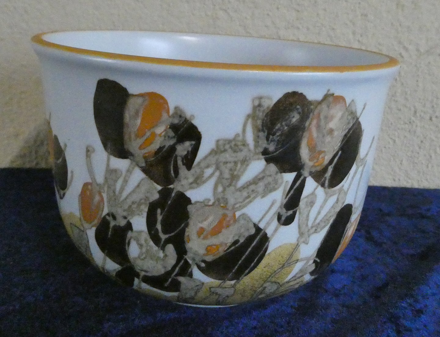 Den er smukt dekoreret og med gul kant.