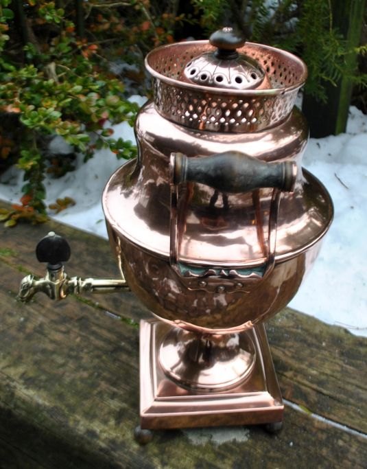 Dansk empire themaskine, 19. årh. Med håndtag i træ. Med hane af messing. H.: 36 cm.