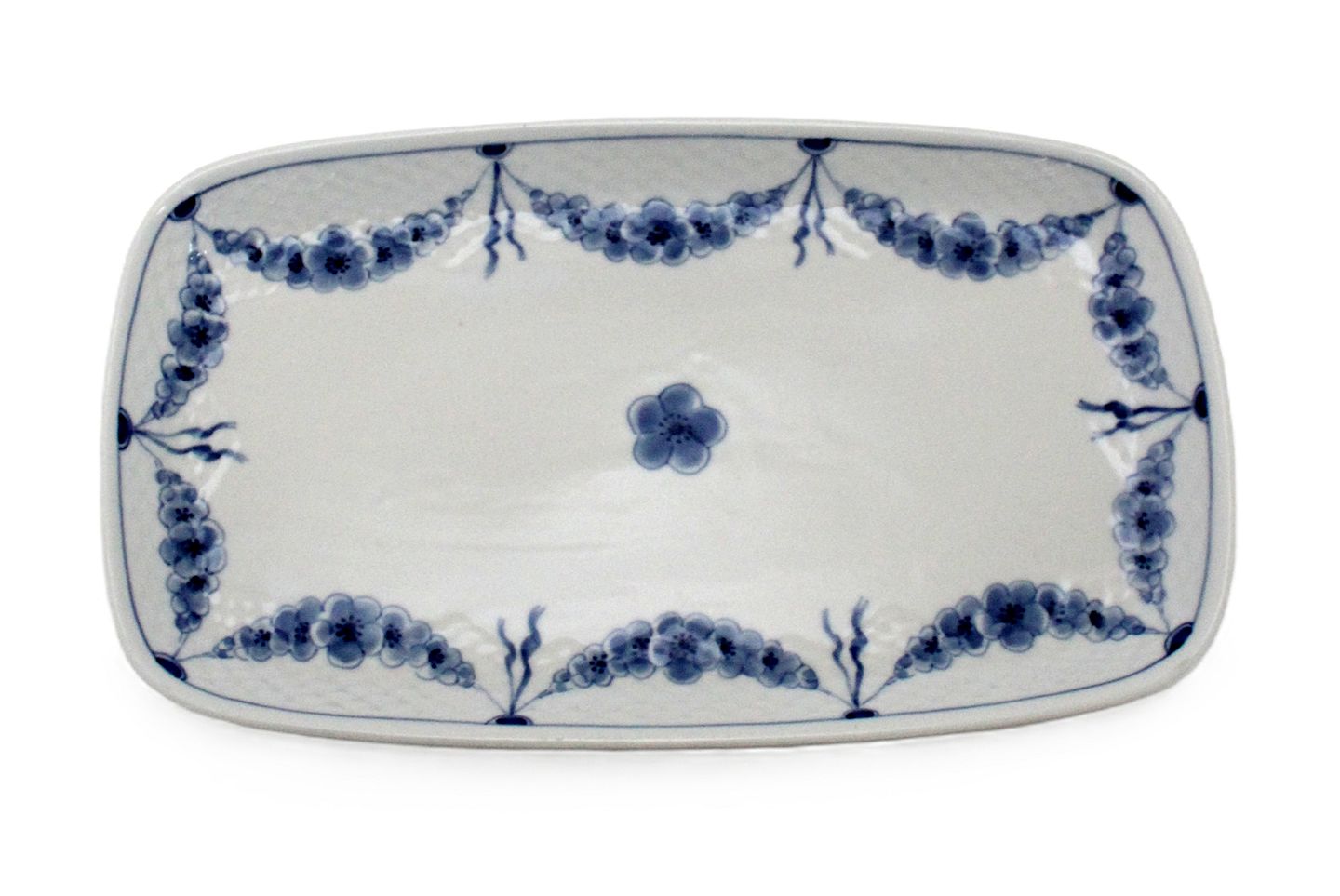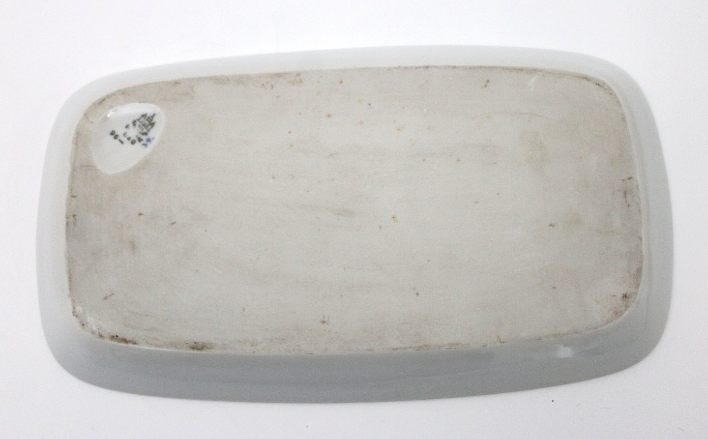 Aflang bakke til sukker og fløde. Kan bruges som serveringsfad eller spisetallerken. Nr. 96. II. sortering. Fin stand. 27 x 15,5 cm. Pris: 250 kr.