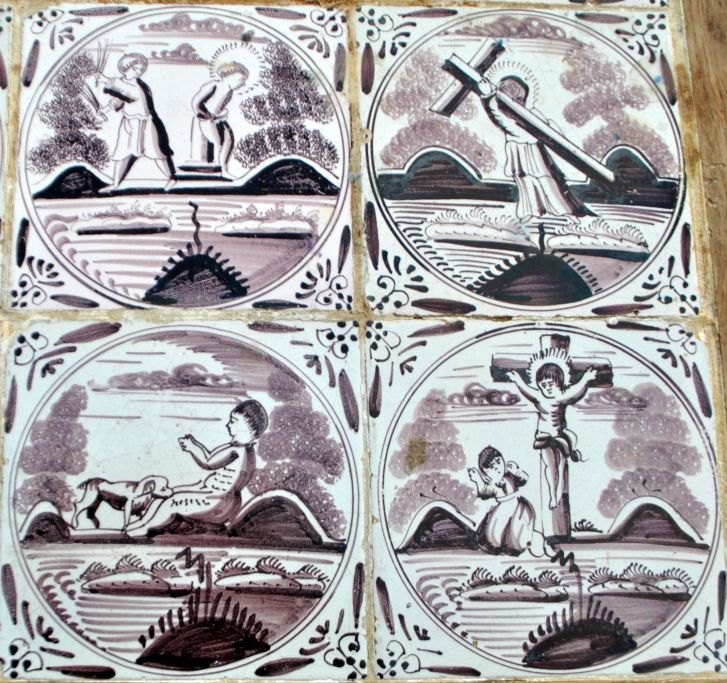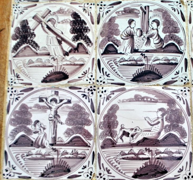Originalt dansk flisebord, Louis XVI, slutningen af 1700-tallet. Egetræ med tandsnit og kalleringer på ben. Plade i form af 15 hollandske manganfarvede fliser fra 1750 - 1775 med bibelske motiver og oksehoved hjørner. H.: 75 cm. L.: 76 cm. B.: 50 cm.