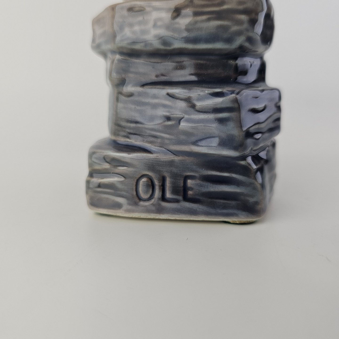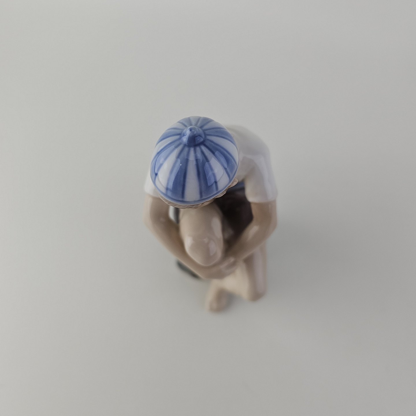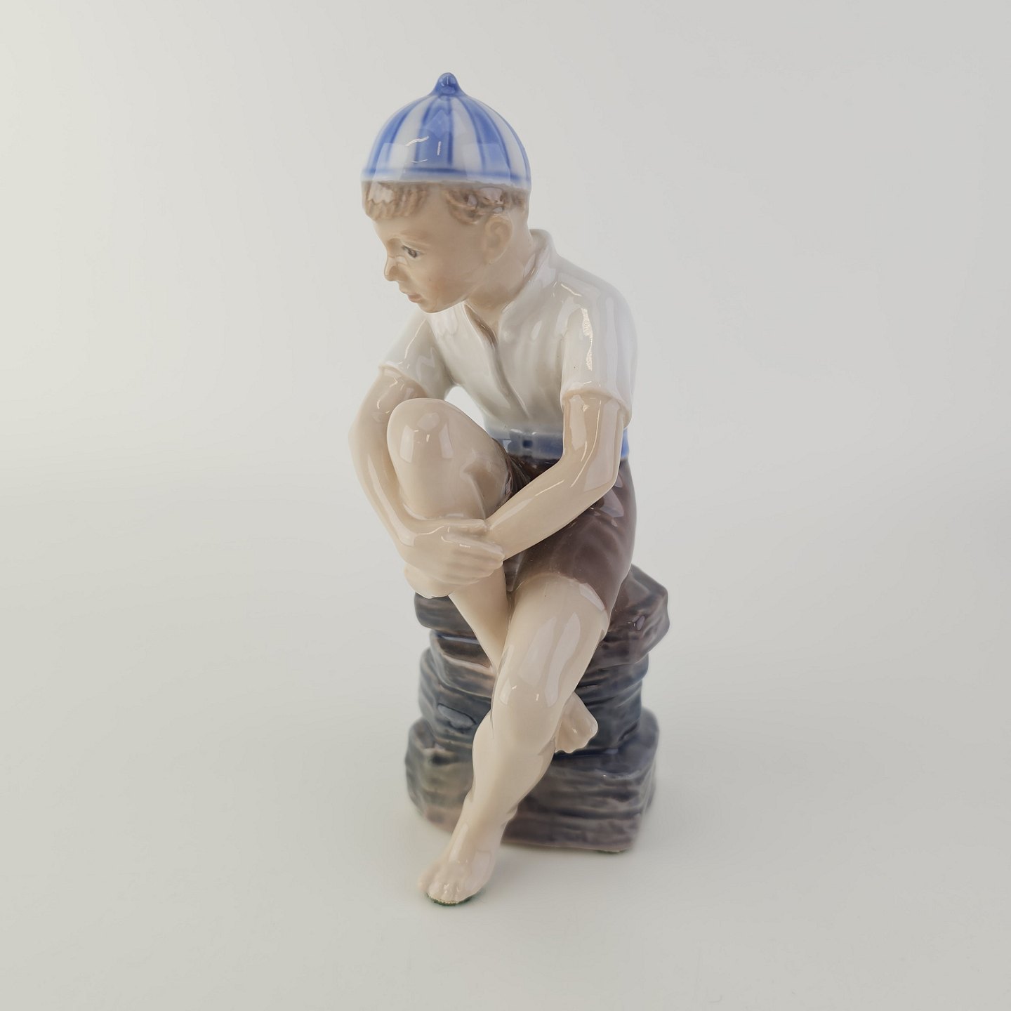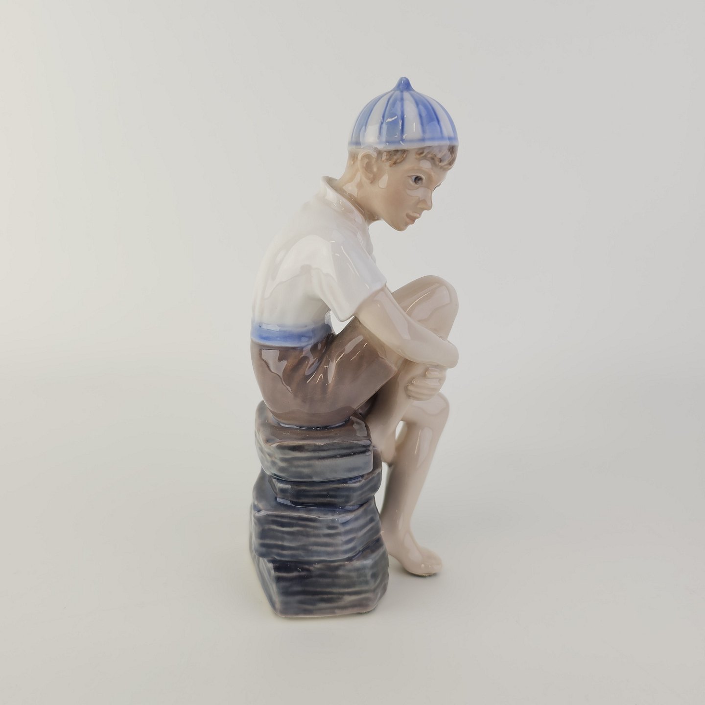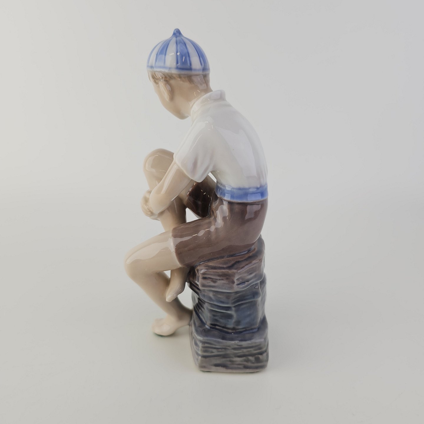 Figur i hvidt porcelæn med motiv af en dreng med navnet Ole i en stribet kasket, som sidder på sten