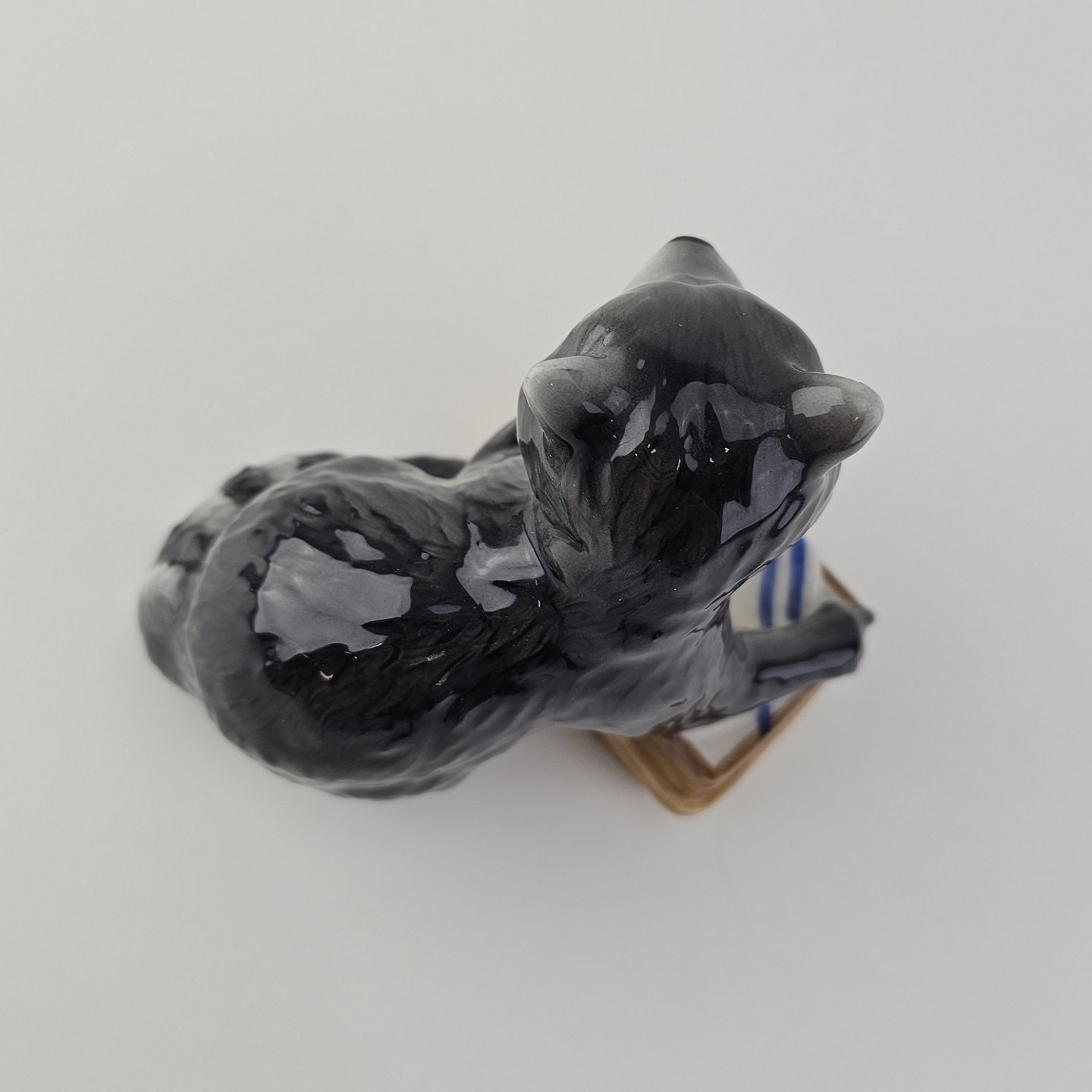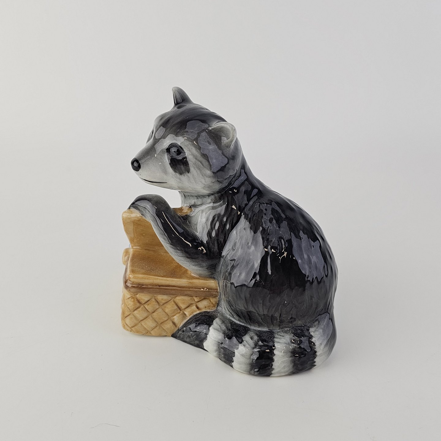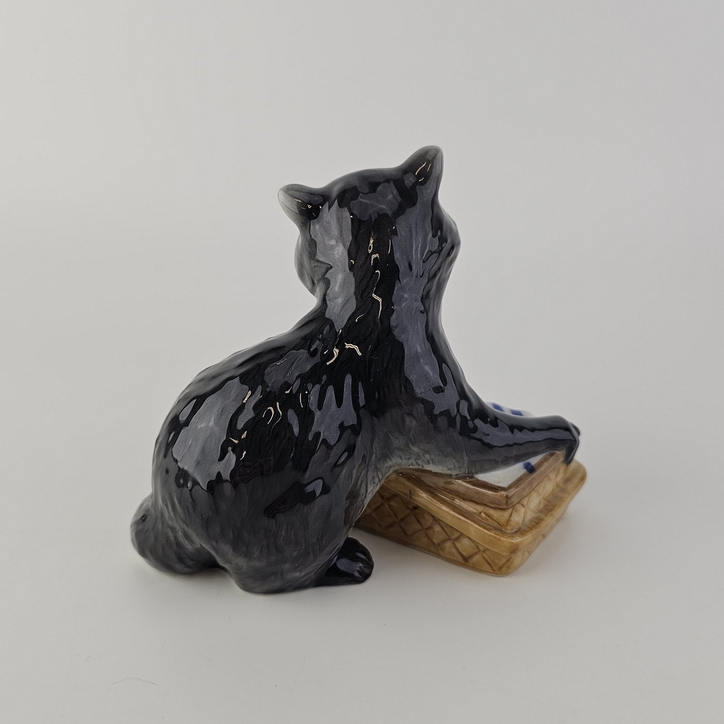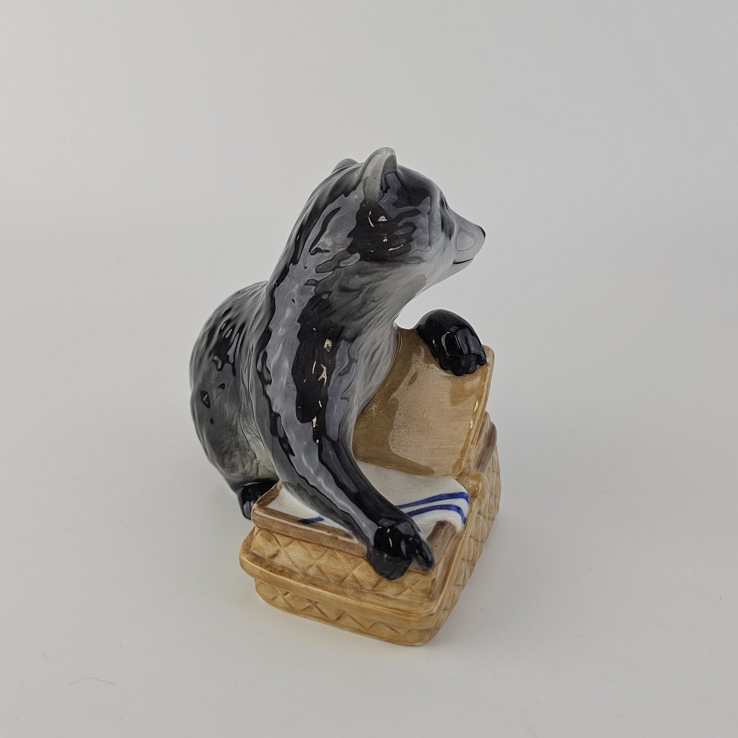 Figur i kongeligt porcelæn med motiv af en vaskebjørn med en picnickurv