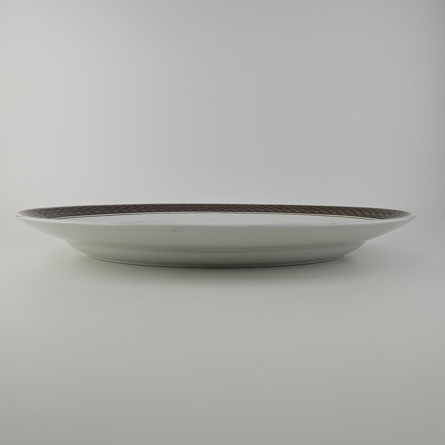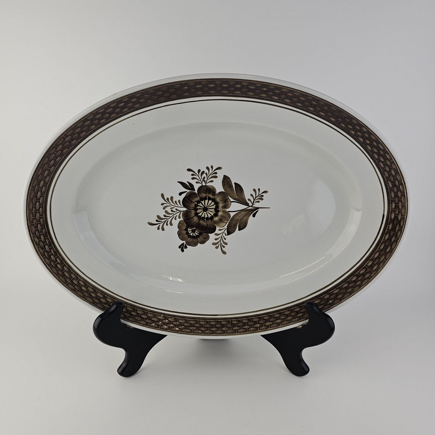 Fajancestellet med flettet kant og dekoration af brune blomster på lys baggrund med brun kant