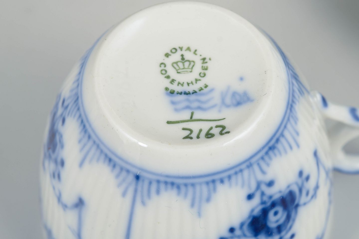 Musselmalet Riflet er Royal Copenhagens ældste og mest ikoniske stel, oprindeligt introduceret i slutningen af 1700-tallet. Det karakteristiske håndmalede mønster og den riflede form er blevet et symbol på dansk porcelænshåndværk og har været i kontinuerlig produktion i generationer.
