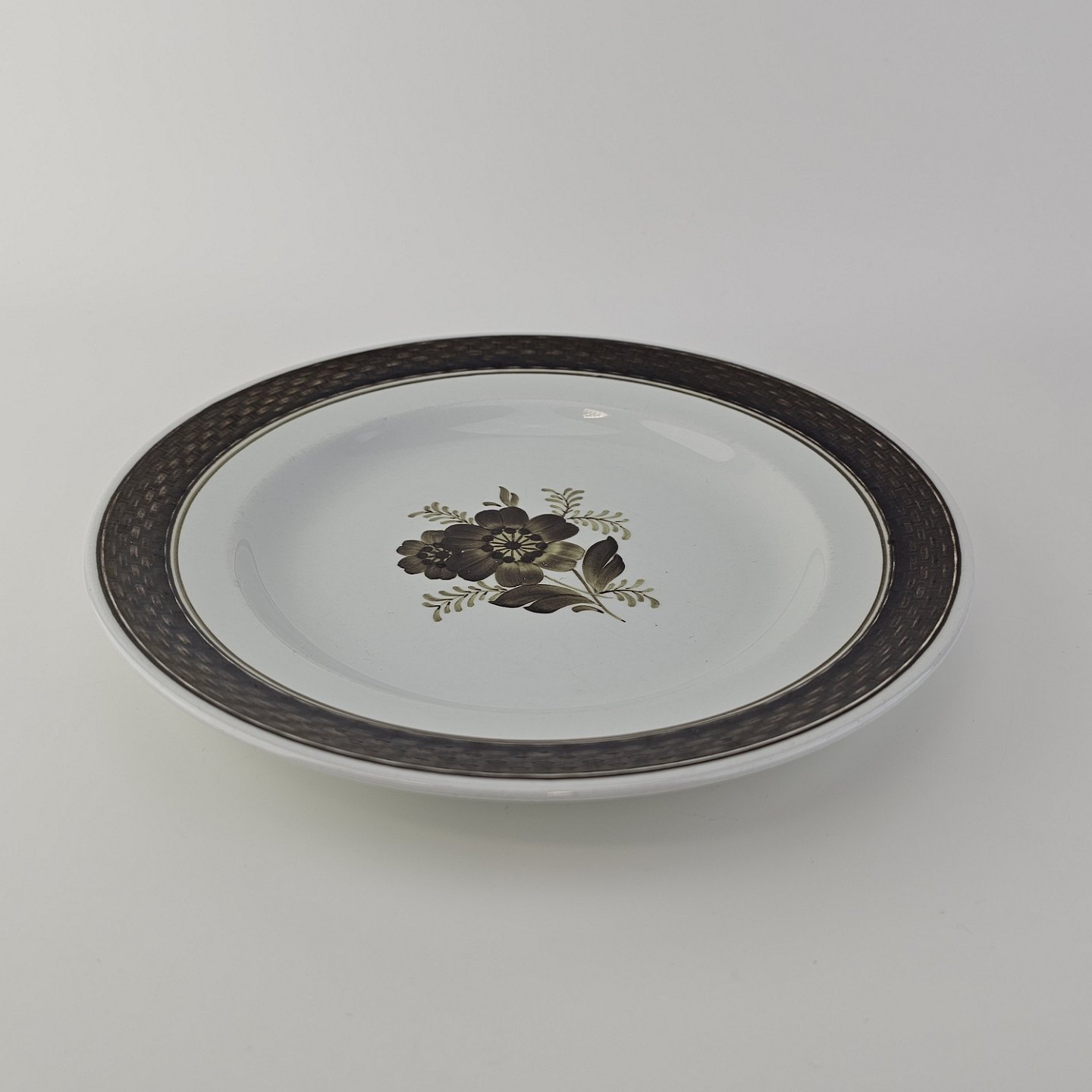 Fajancestellet med flettet kant og dekoration af brune blomster på lys baggrund med brun kant