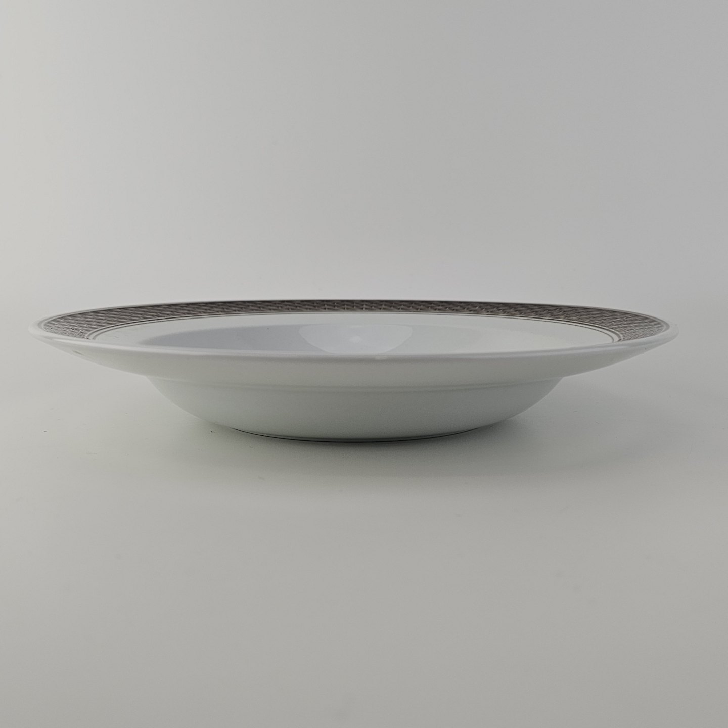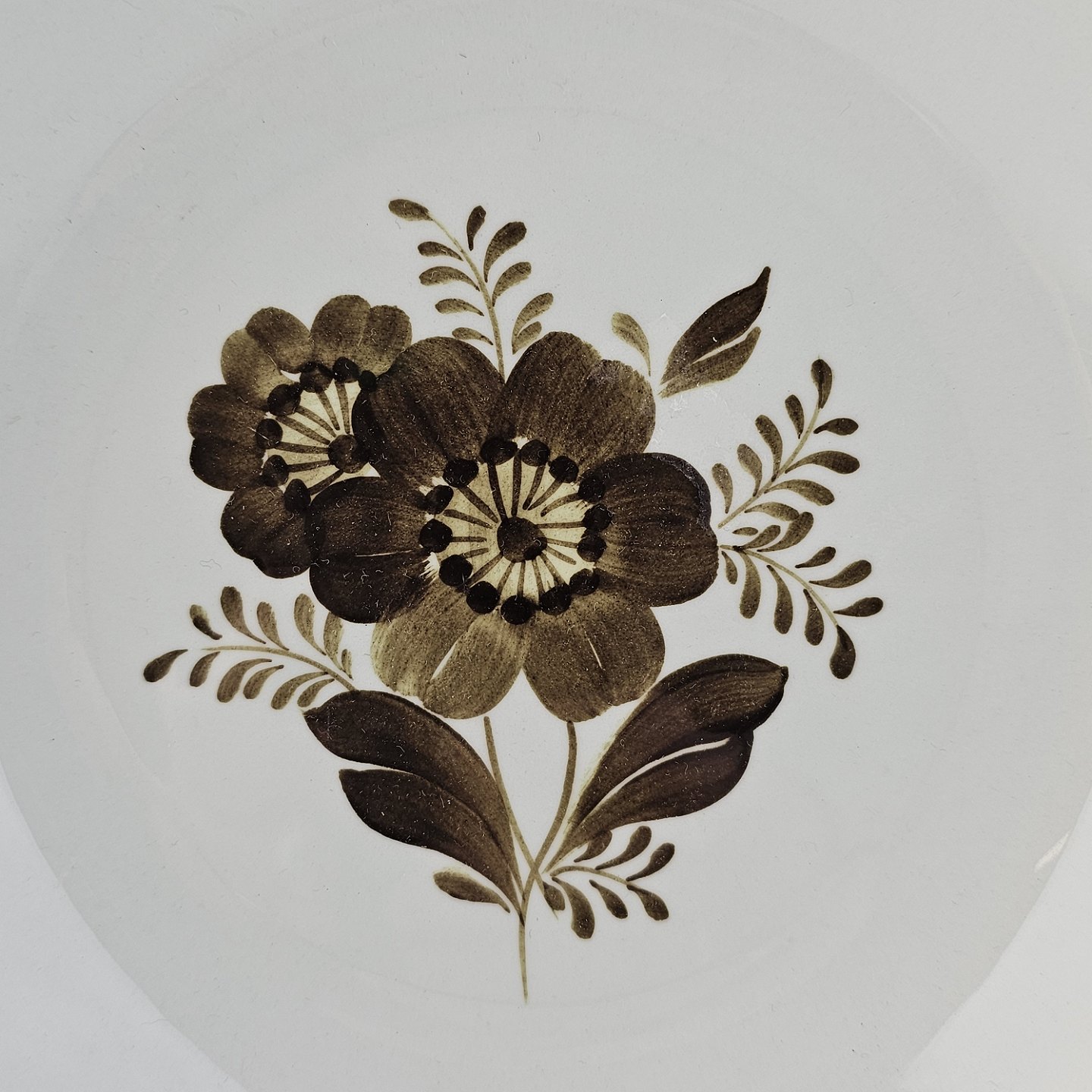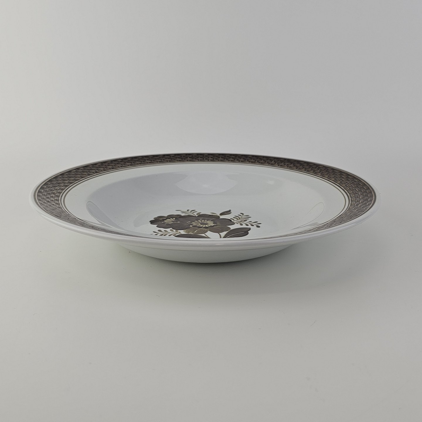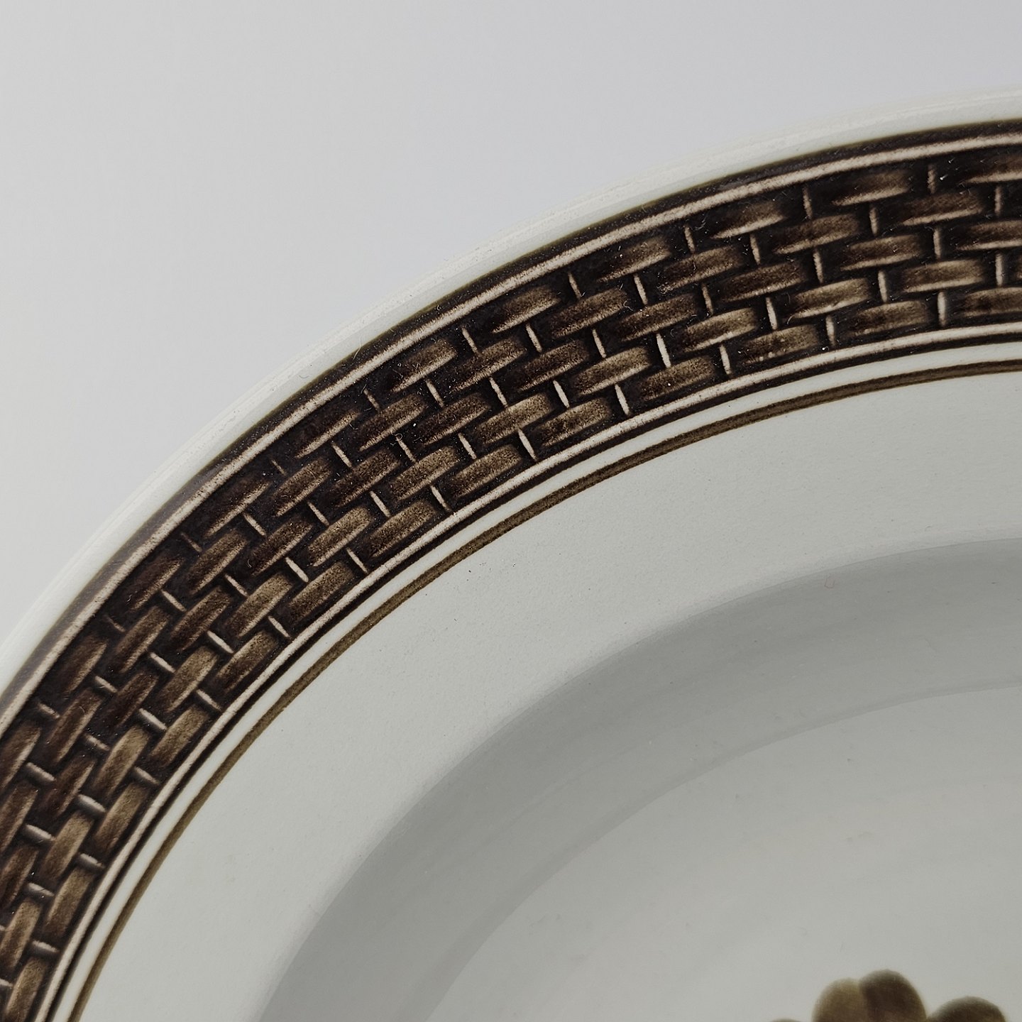 Fajancestellet med flettet kant og dekoration af brune blomster på lys baggrund med brun kant