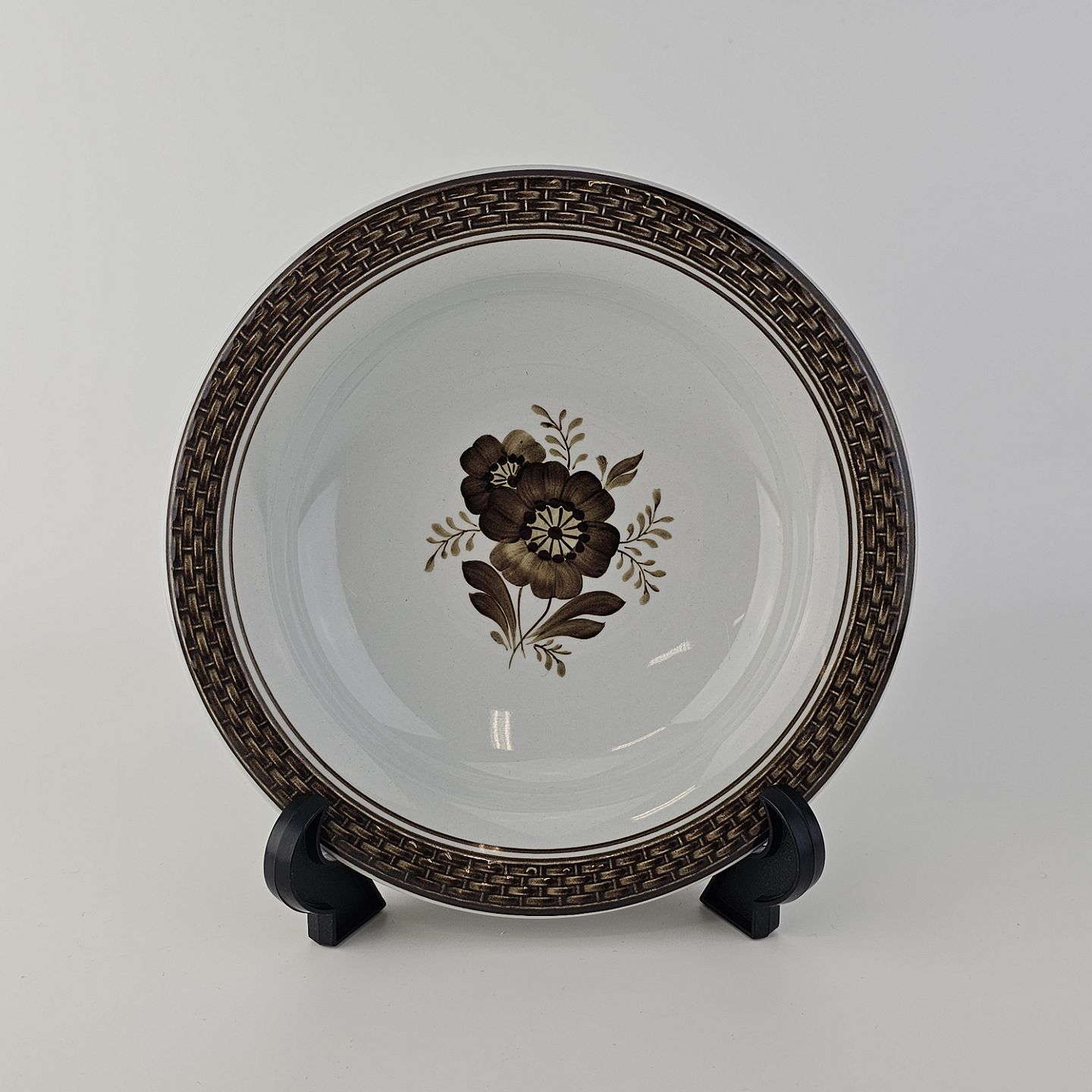 Fajancestellet med flettet kant og dekoration af brune blomster på lys baggrund med brun kant