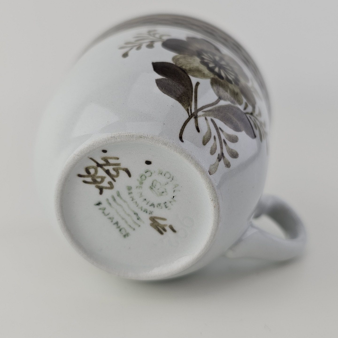 Moccakop med underkop i fajance fra stellet Brun Tranquebar fra år 1919