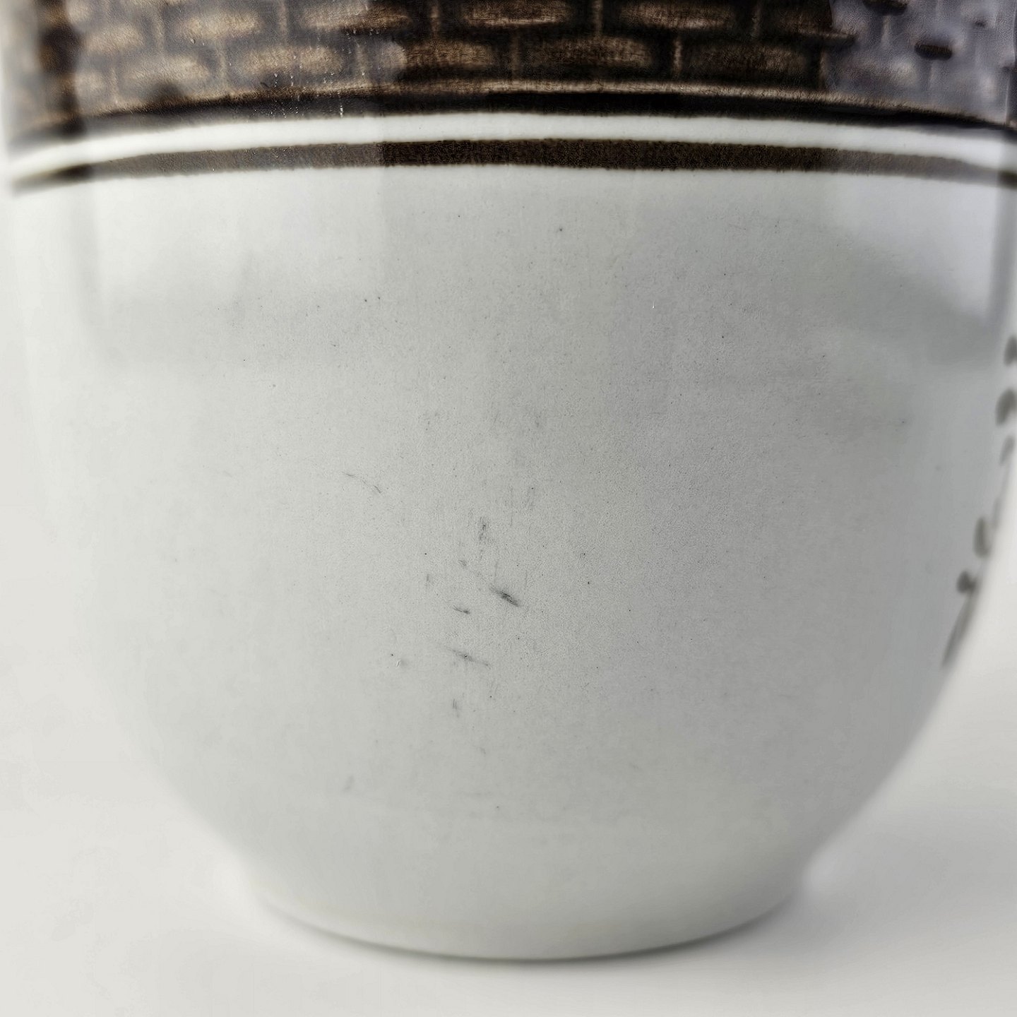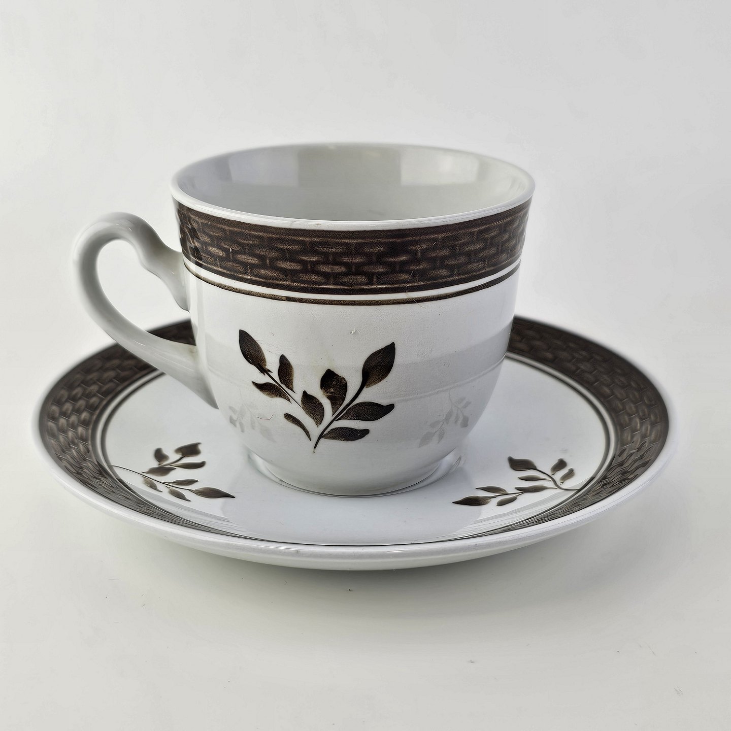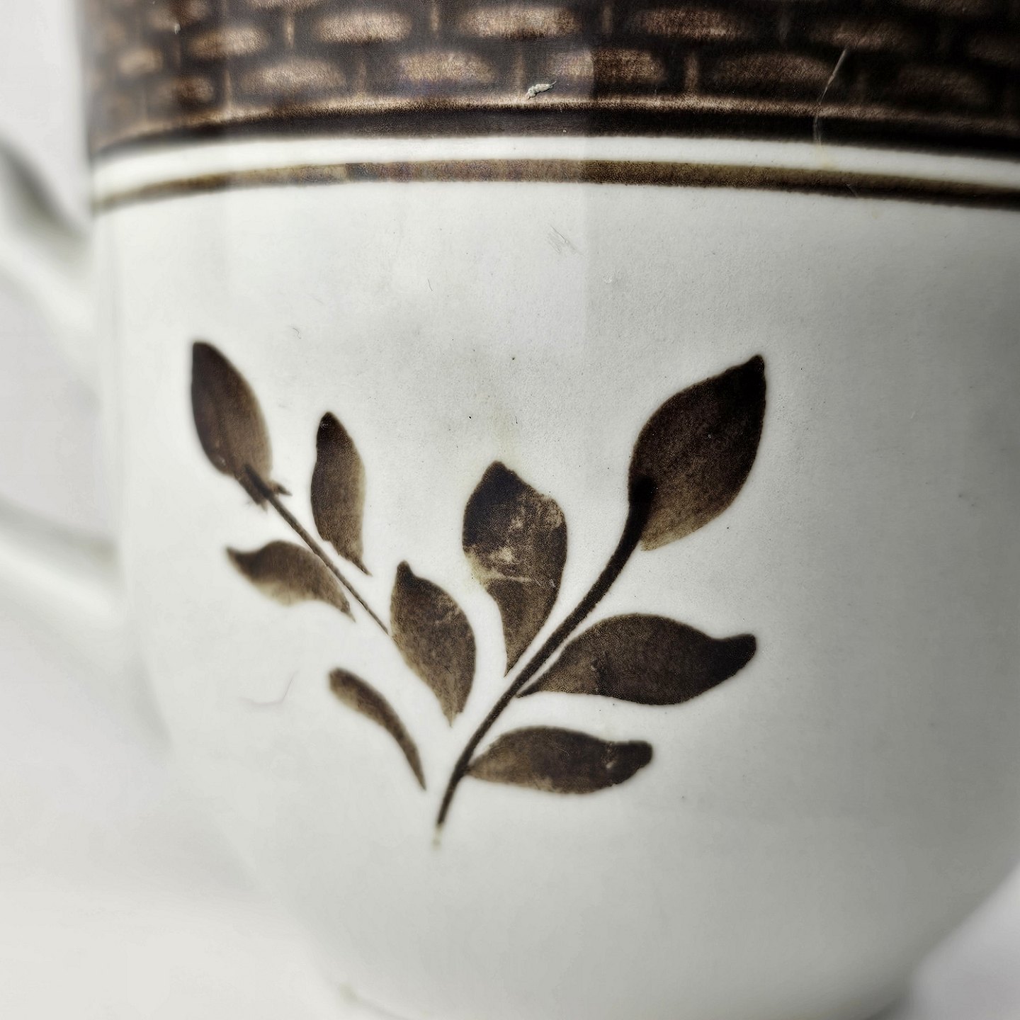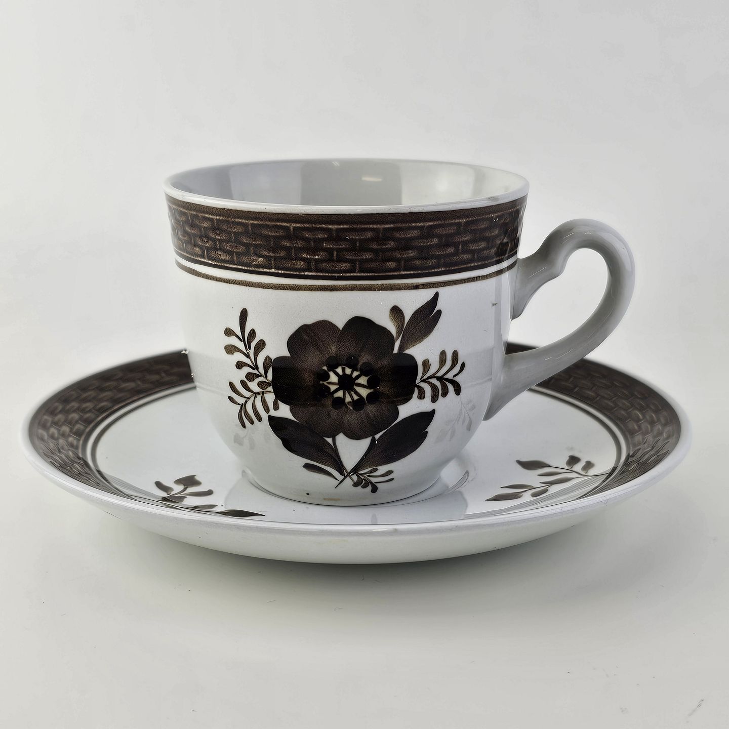 Fajancestellet med flettet kant og dekoration af brune blomster på lys baggrund med brun kant
