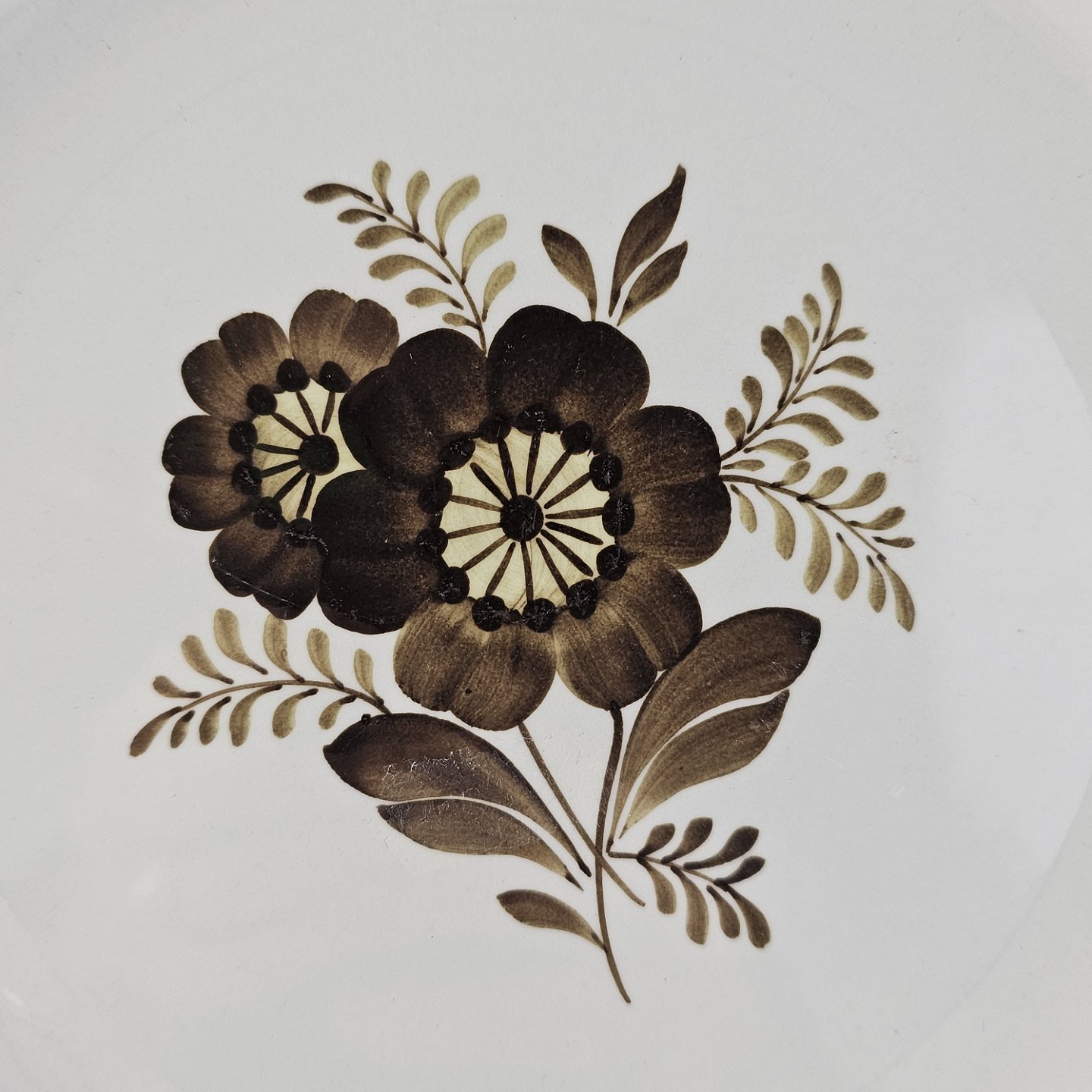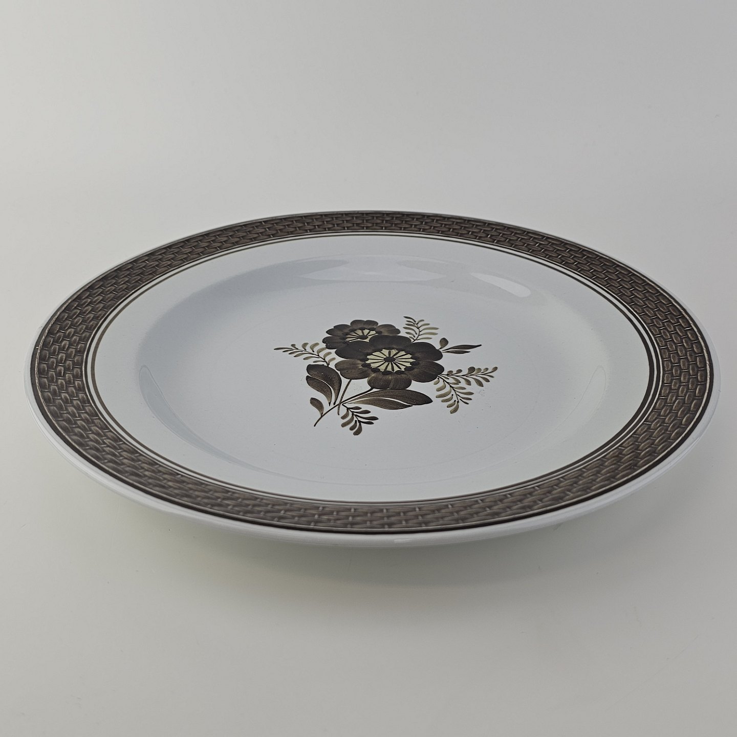 Fajancestellet med flettet kant og dekoration af brune blomster på lys baggrund med brun kant