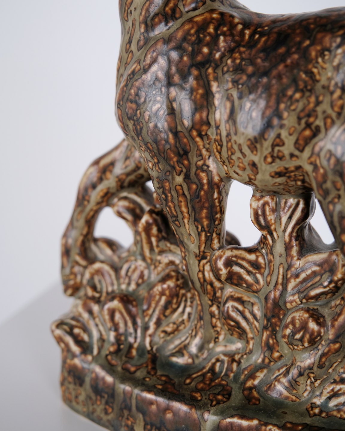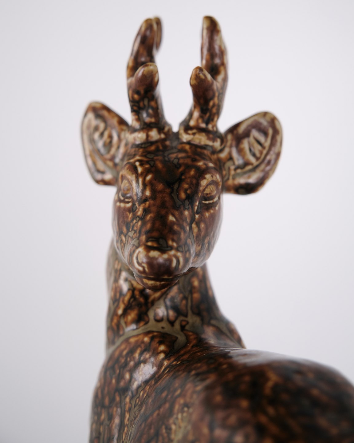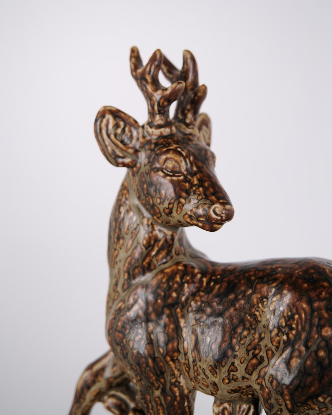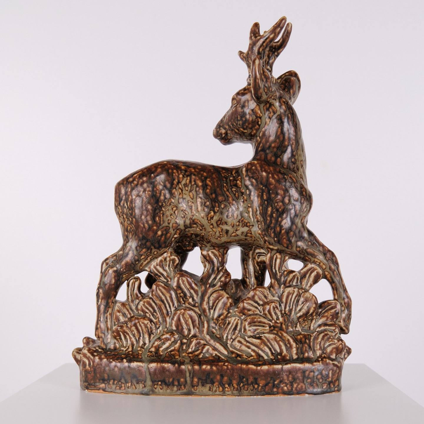 Stentøjsfigur med motiv af stående hjort, model nr. 21333, designet af Knud Kyhn for Royal Copenhagen. Figuren er udført i stentøj og indgår i Knud Kyhns serie af dyrefigurer produceret hos Royal Copenhagen i midten af det 20. århundrede. Modellen er kendetegnet ved en markant kropsform og tydelig bearbejdning af overfladen, som er gennemgående for Kyhns arbejde med naturmotiver.