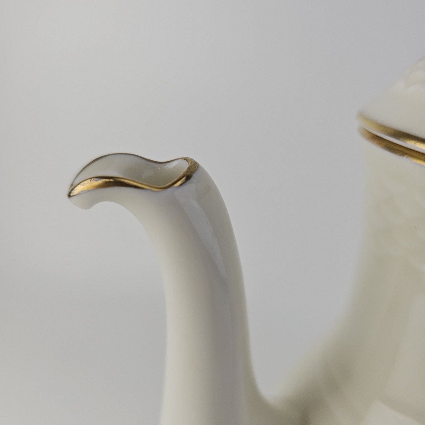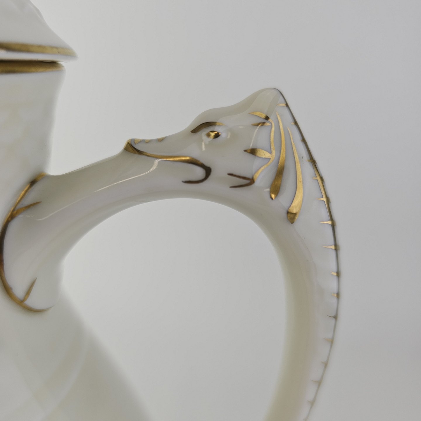 Frigga Anemone er cremefarvet porcelæn dekoreret med motiv af anemoner og bøgeløv med guldkant