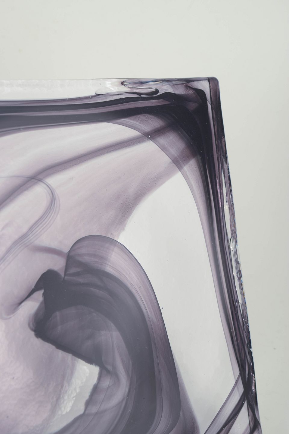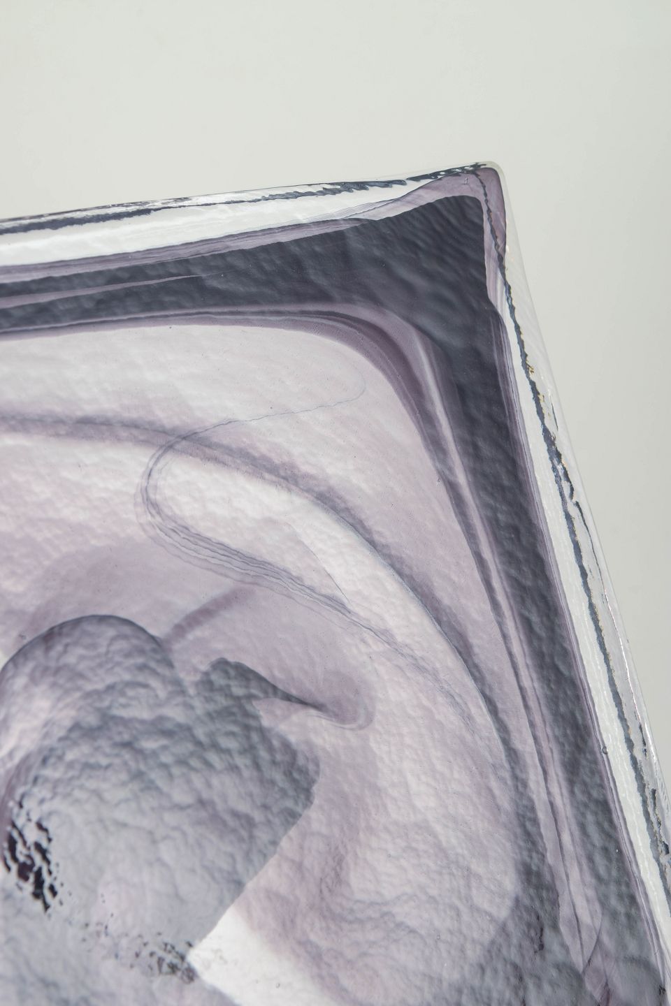 Fladt, kvadratisk objekt i klart glas med indkapslede, slyngede sorte og grå glastråde, der danner et abstrakt cirrus-lignende mønster. Modellen er kendt som Cirrus Black.