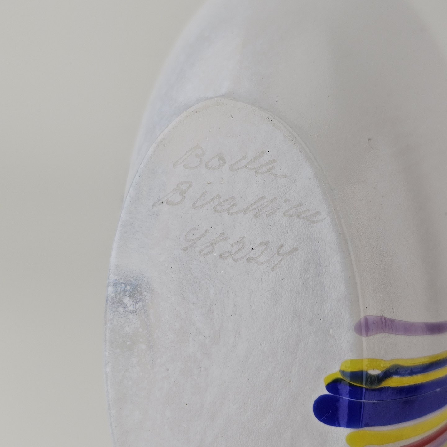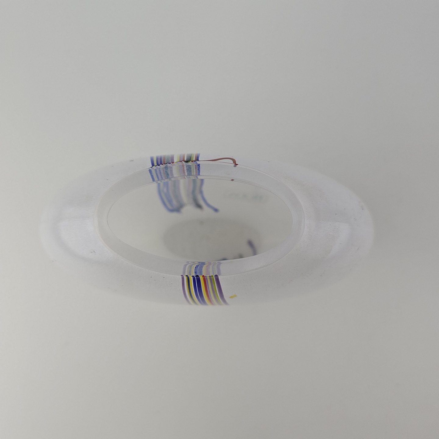 Rund vase i glas med dekoration af linjer og streger i flere farver