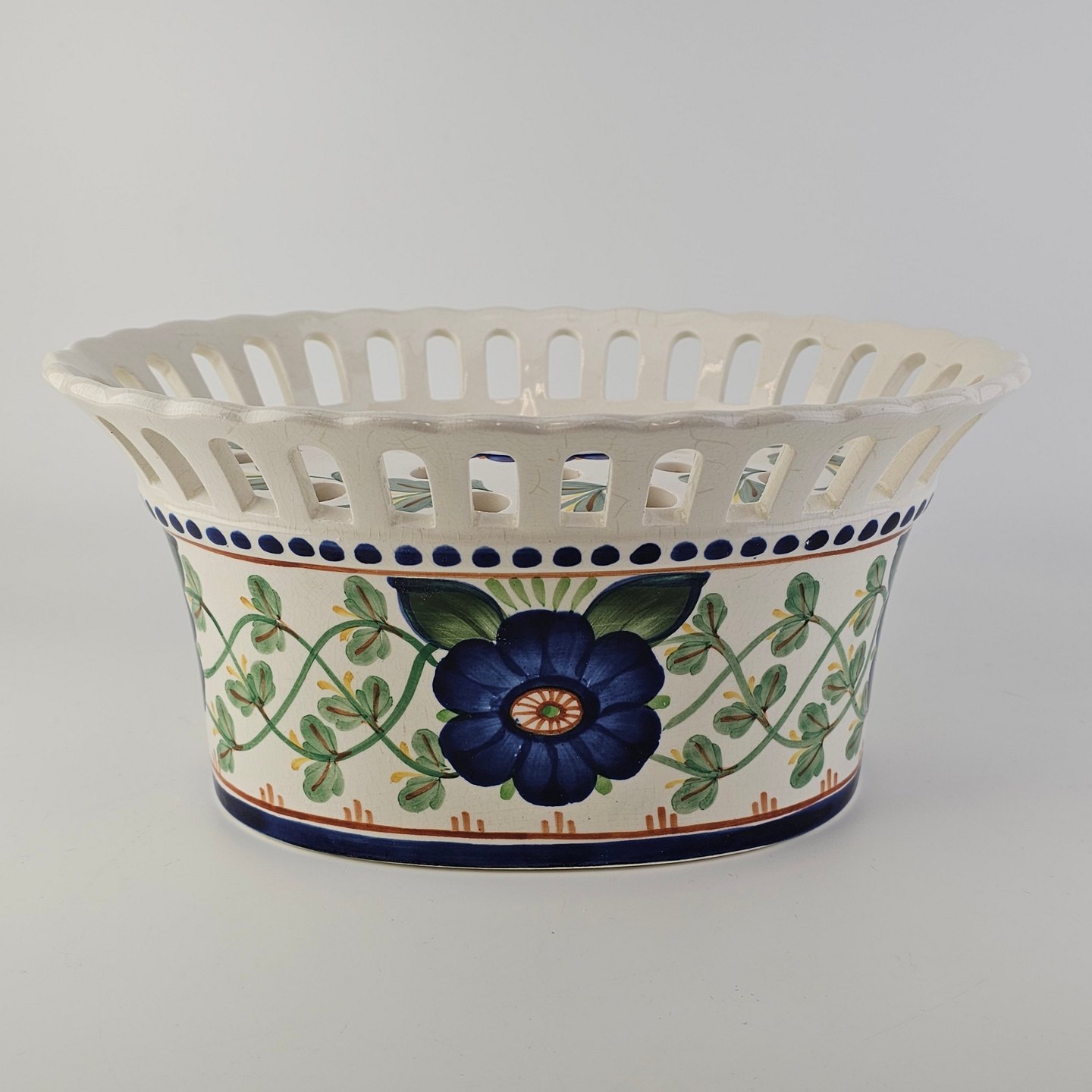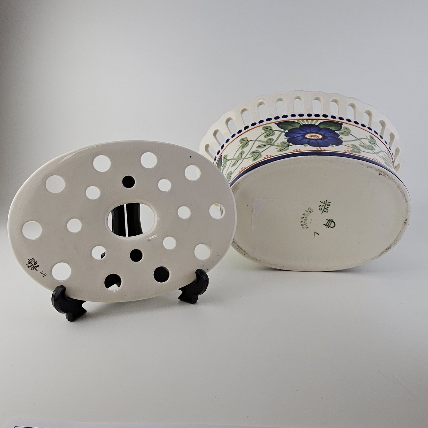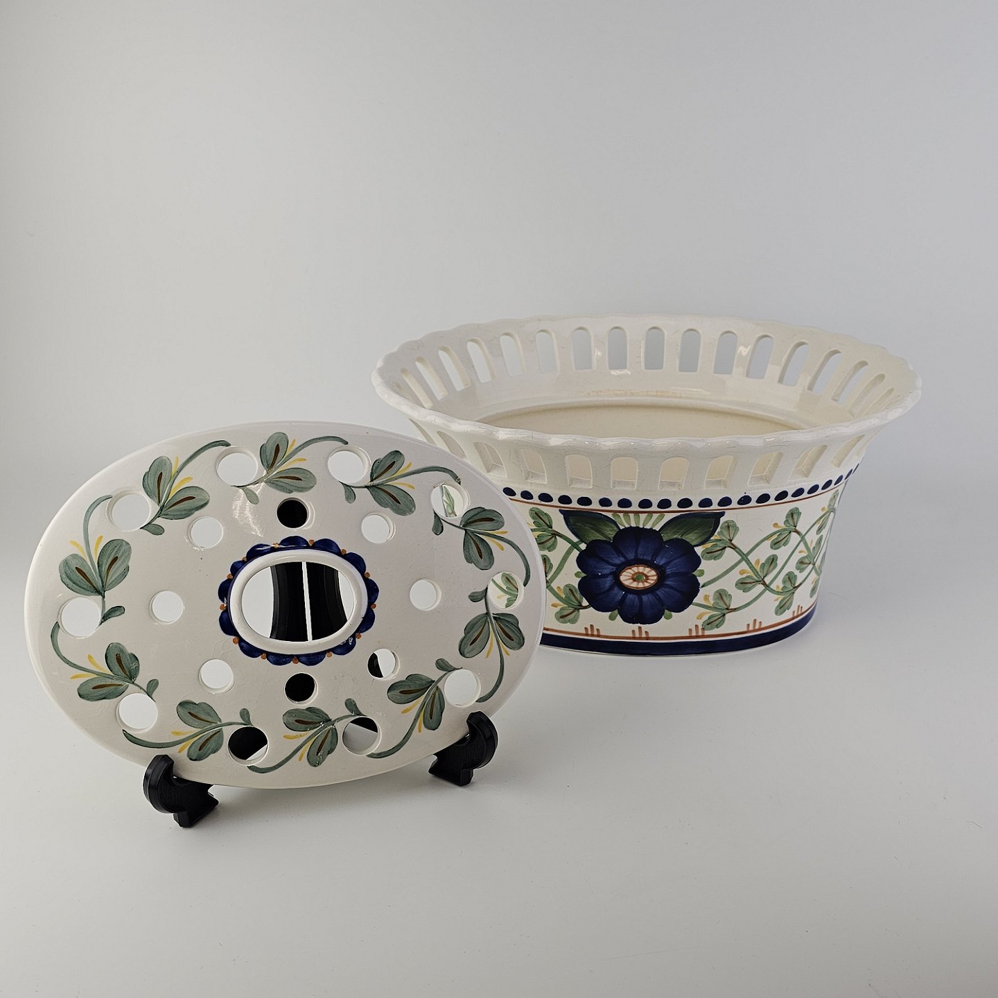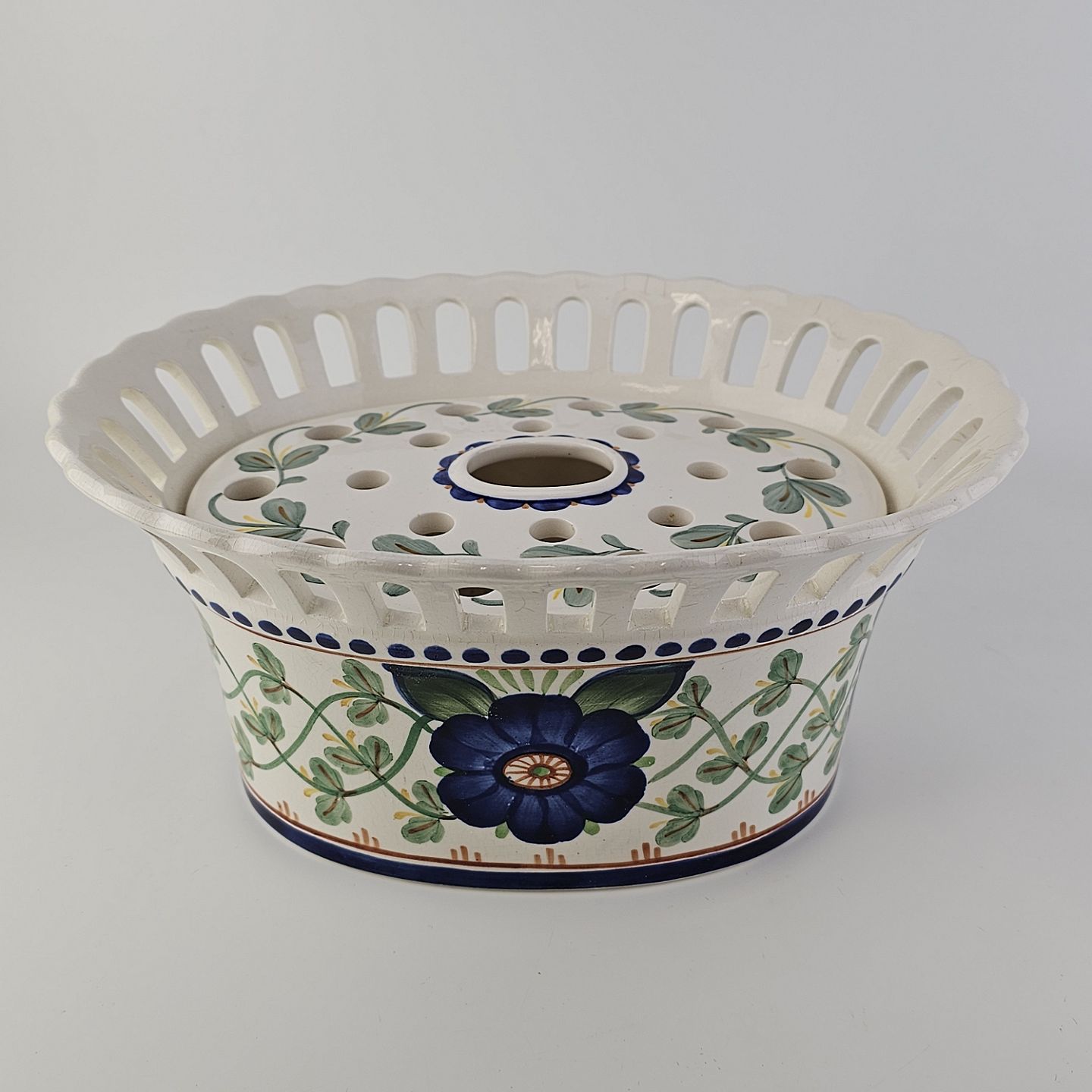 Oval jardiniere med låg i fajance med dekoration af en blå blomst og grønne blade. Nr. 1042/720