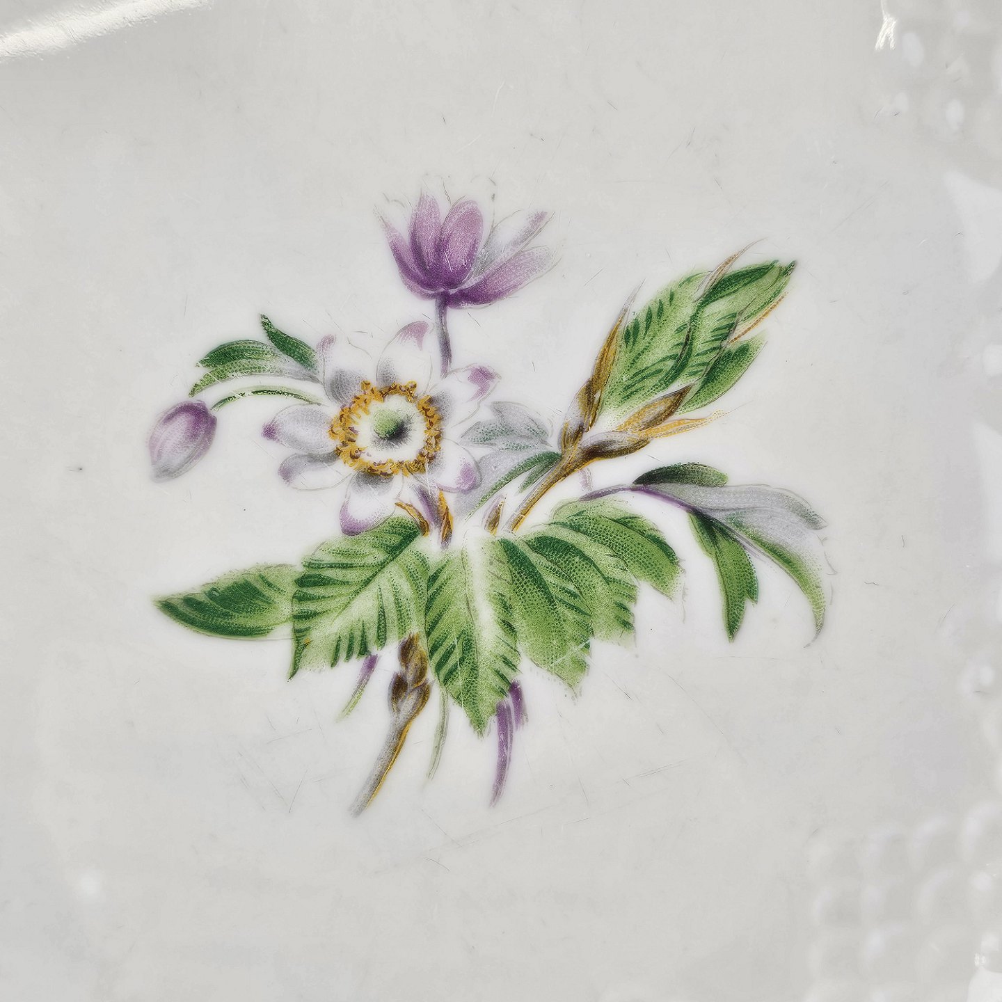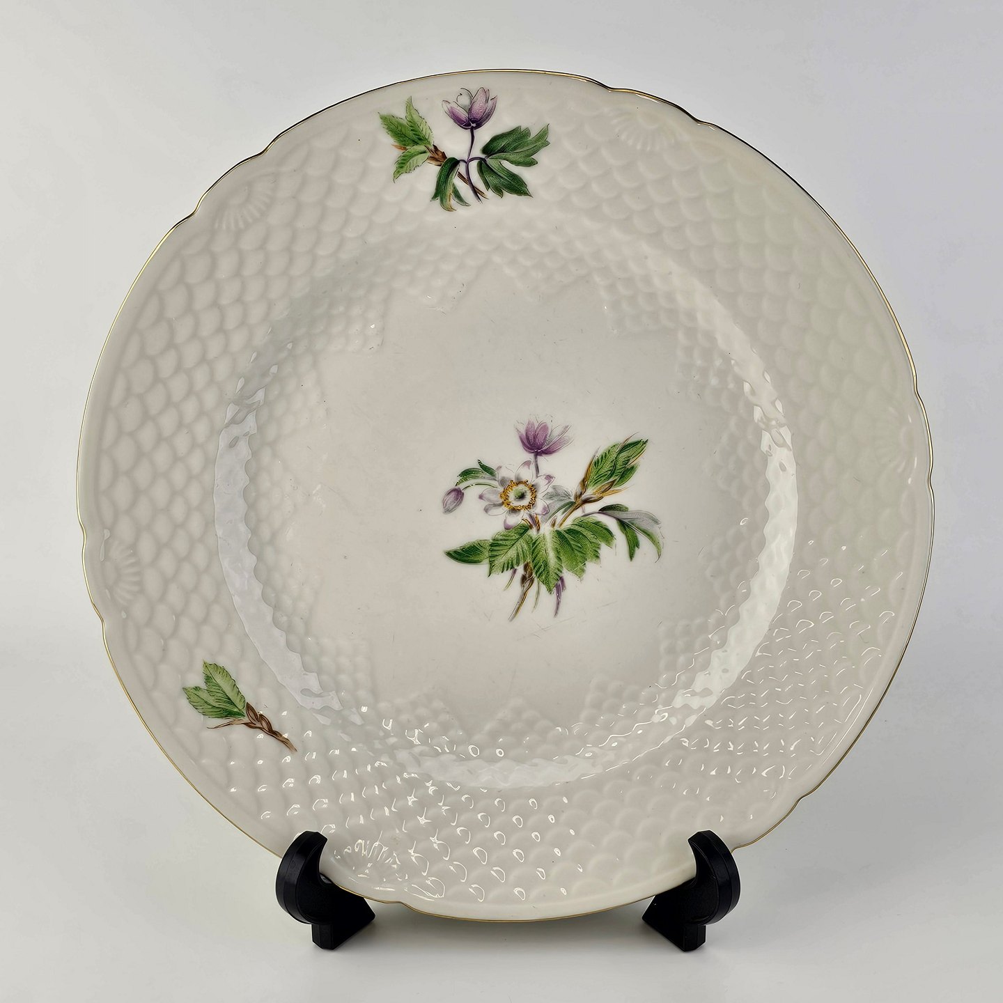 Frigga Anemone er cremefarvet porcelæn dekoreret med motiv af anemoner og bøgeløv med guldkant