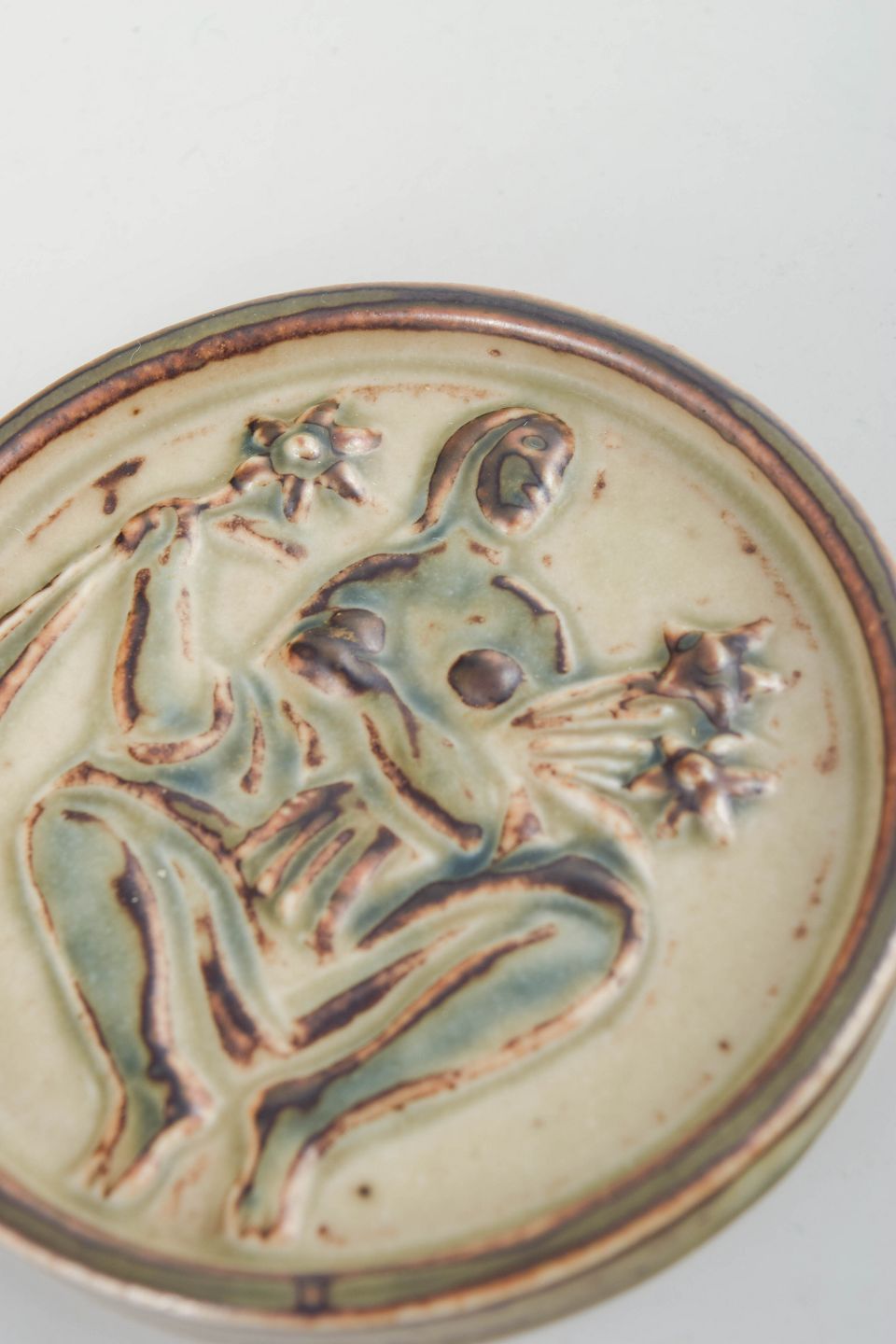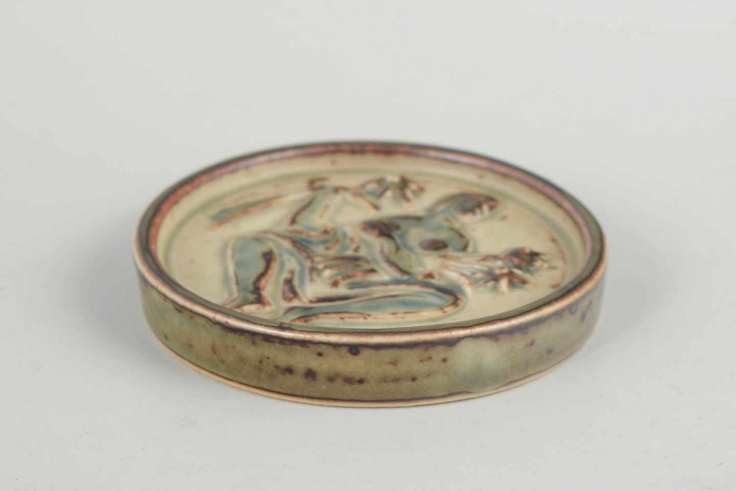 Reliefdekoreret miniaturefad i glaseret keramik med figurmotiv, model 21175.