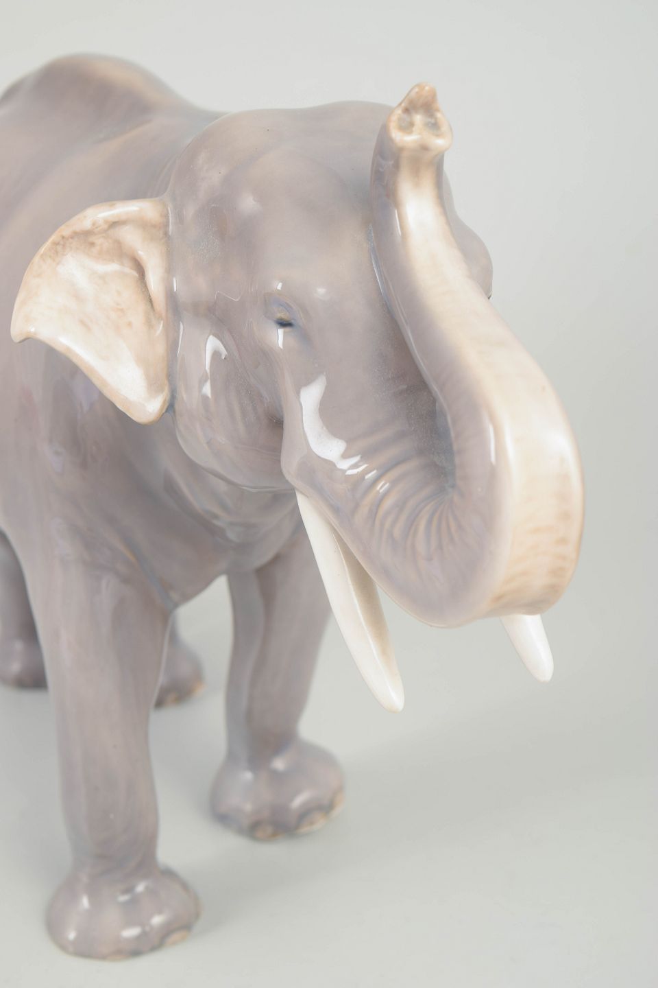 Naturalistisk modelleret elefantfigur i glaseret porcelæn, model 1373, med løftet snabel og detaljeret gengivelse af hud og proportioner.