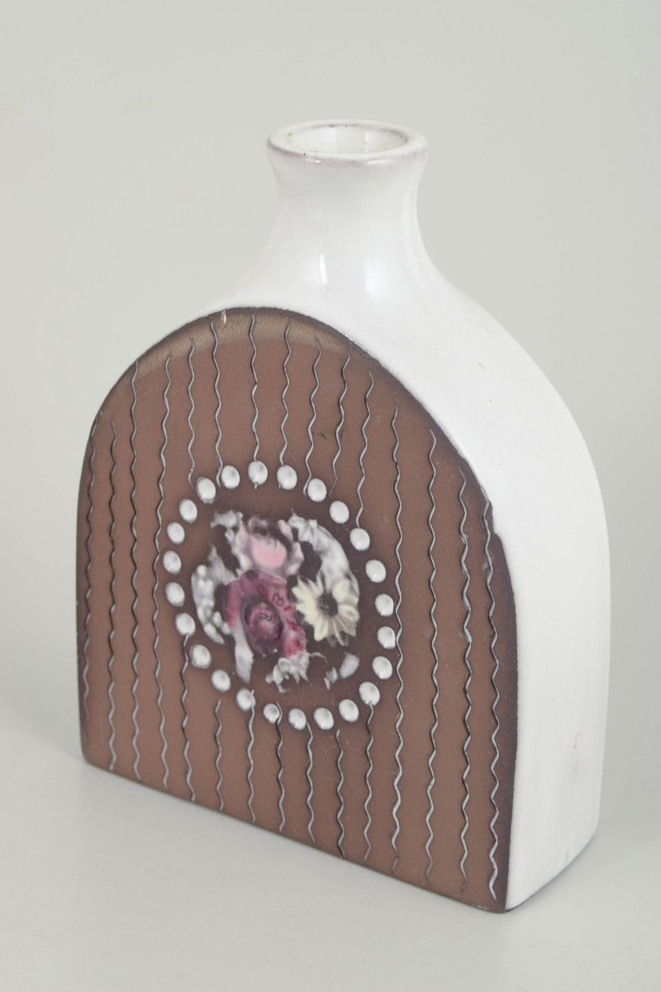 Figurativ vase med stiliseret kvindeportræt dekoreret med blomster og geometriske ornamenter i relief og farvet glasur.