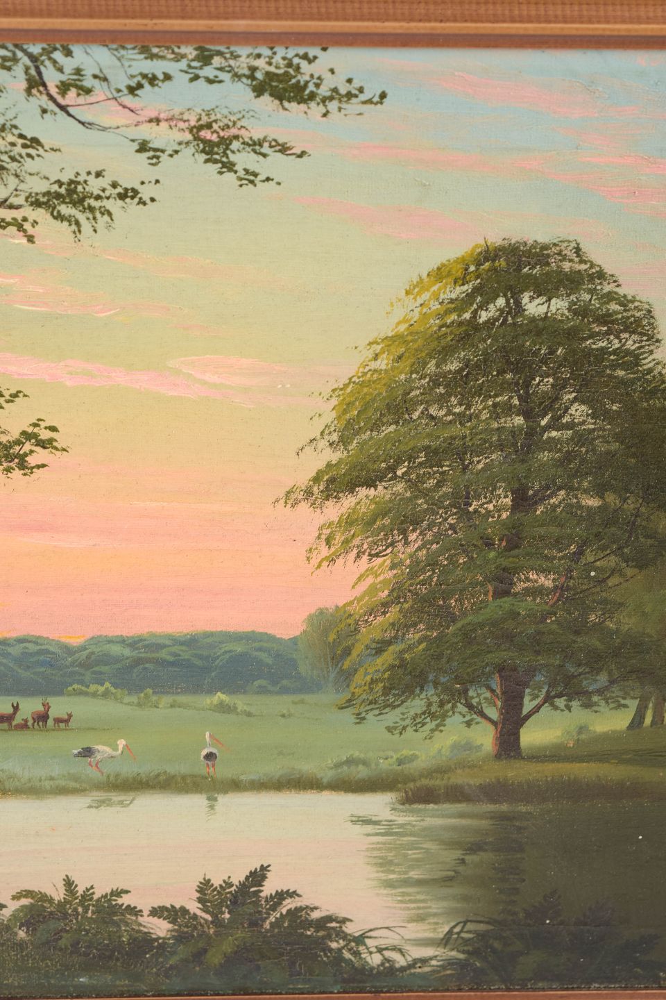 Landskabsmotiv fra Dyrehaven med sø, træer og hjorte i et stemningsfuldt skumringslys, udført som oliemaleri på lærred og signeret nederst til højre.