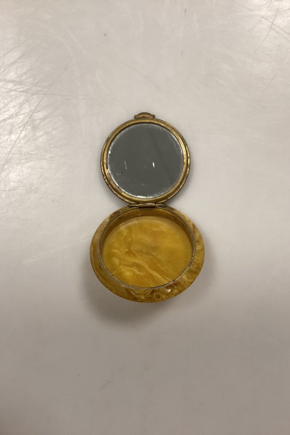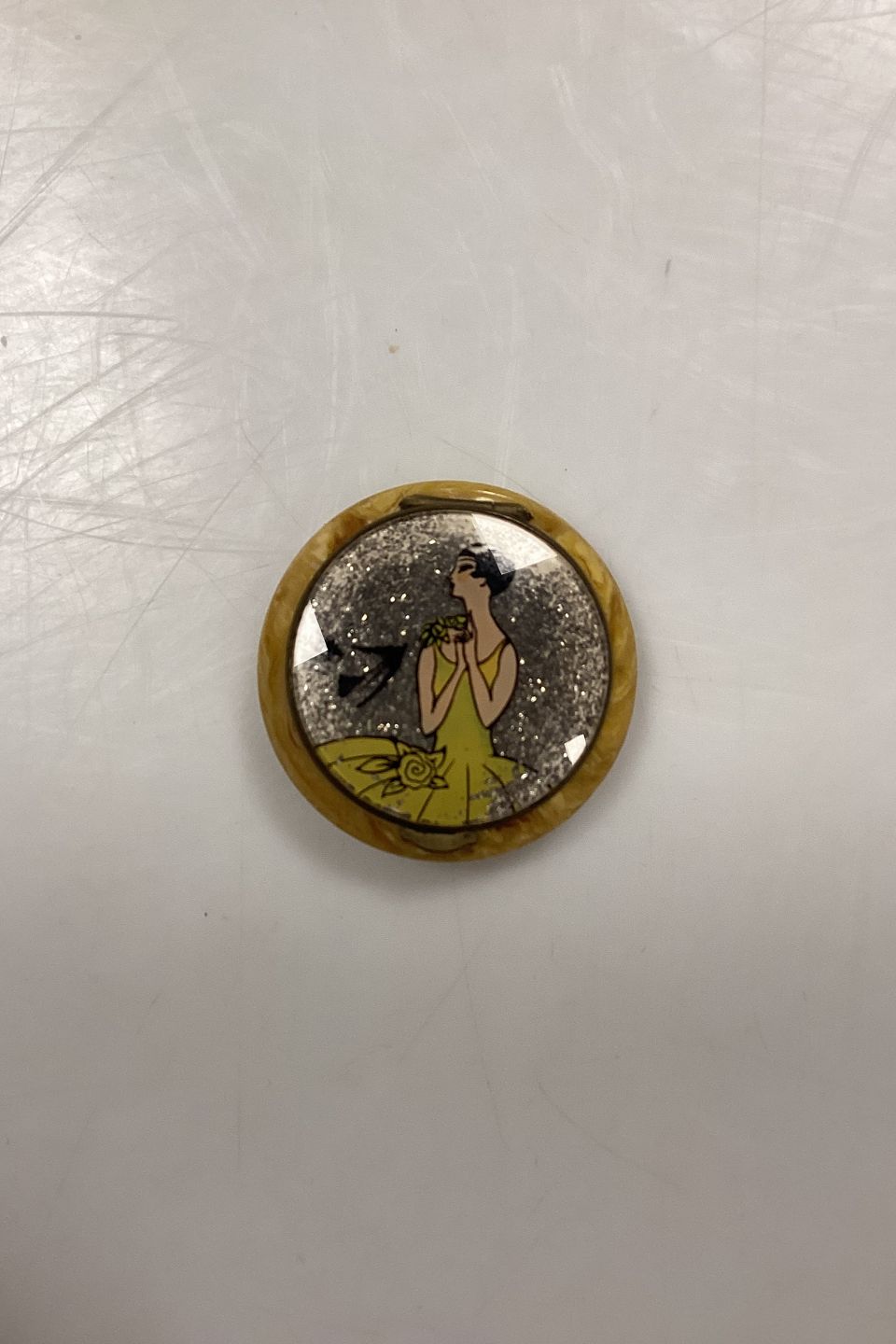 Art Deco Pilleæske med Spejl. Formentlig bakelit i gul marmorering. Motiv med kvinde i gul kjole på baggrund af sølvglitter.