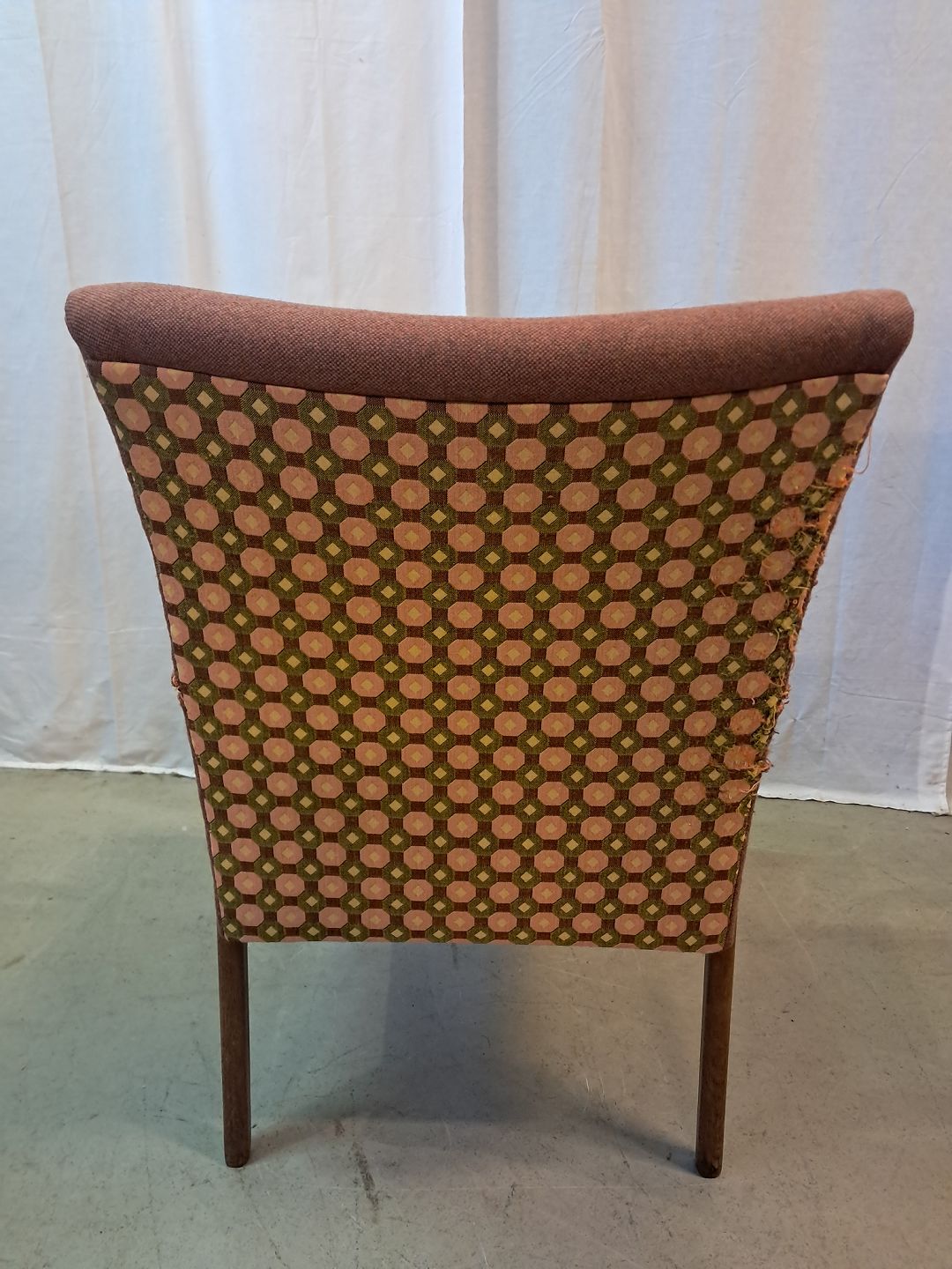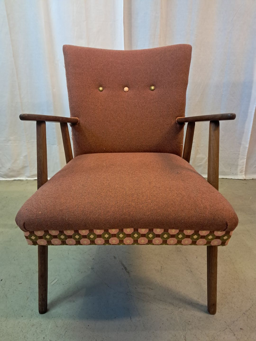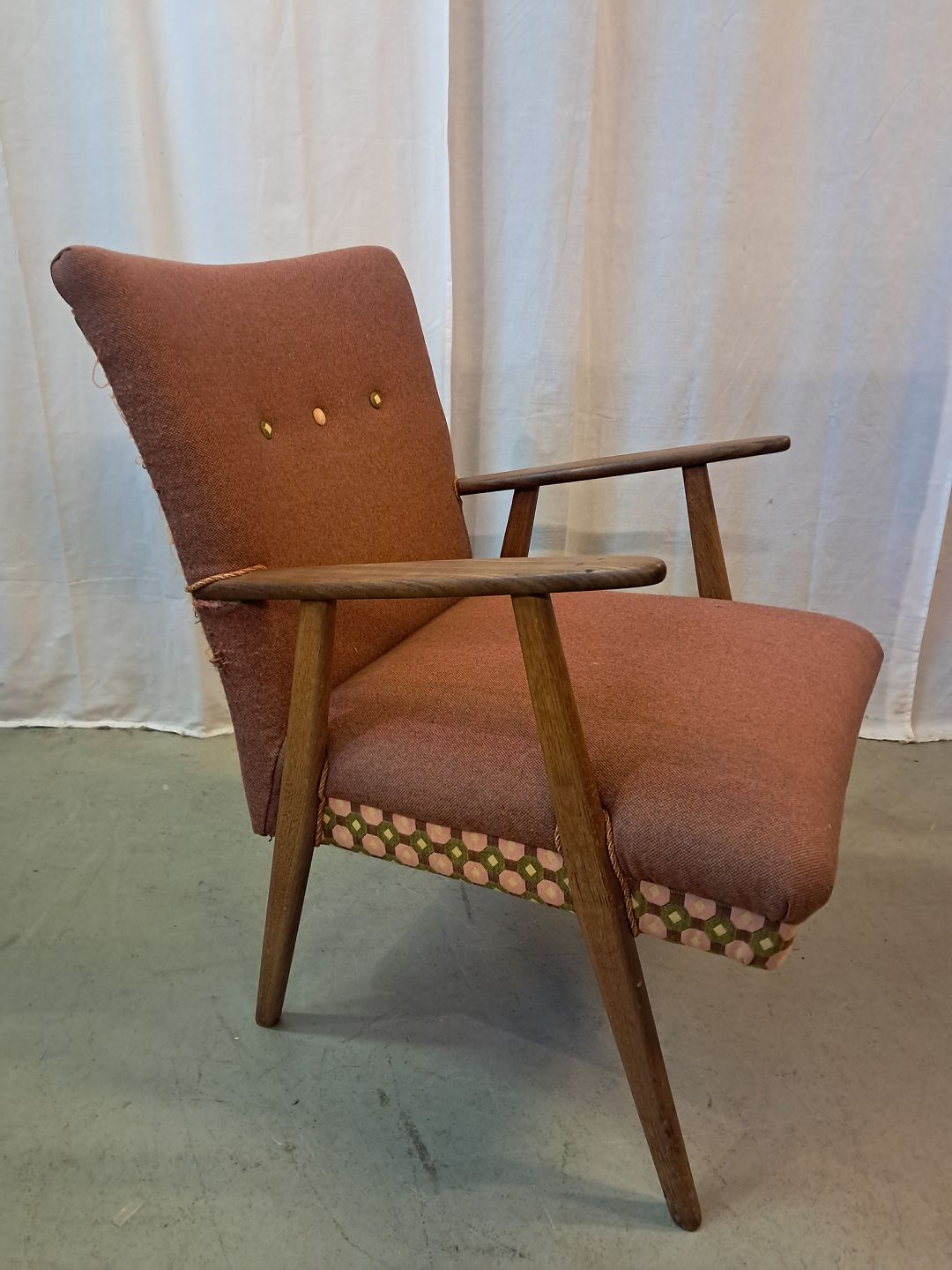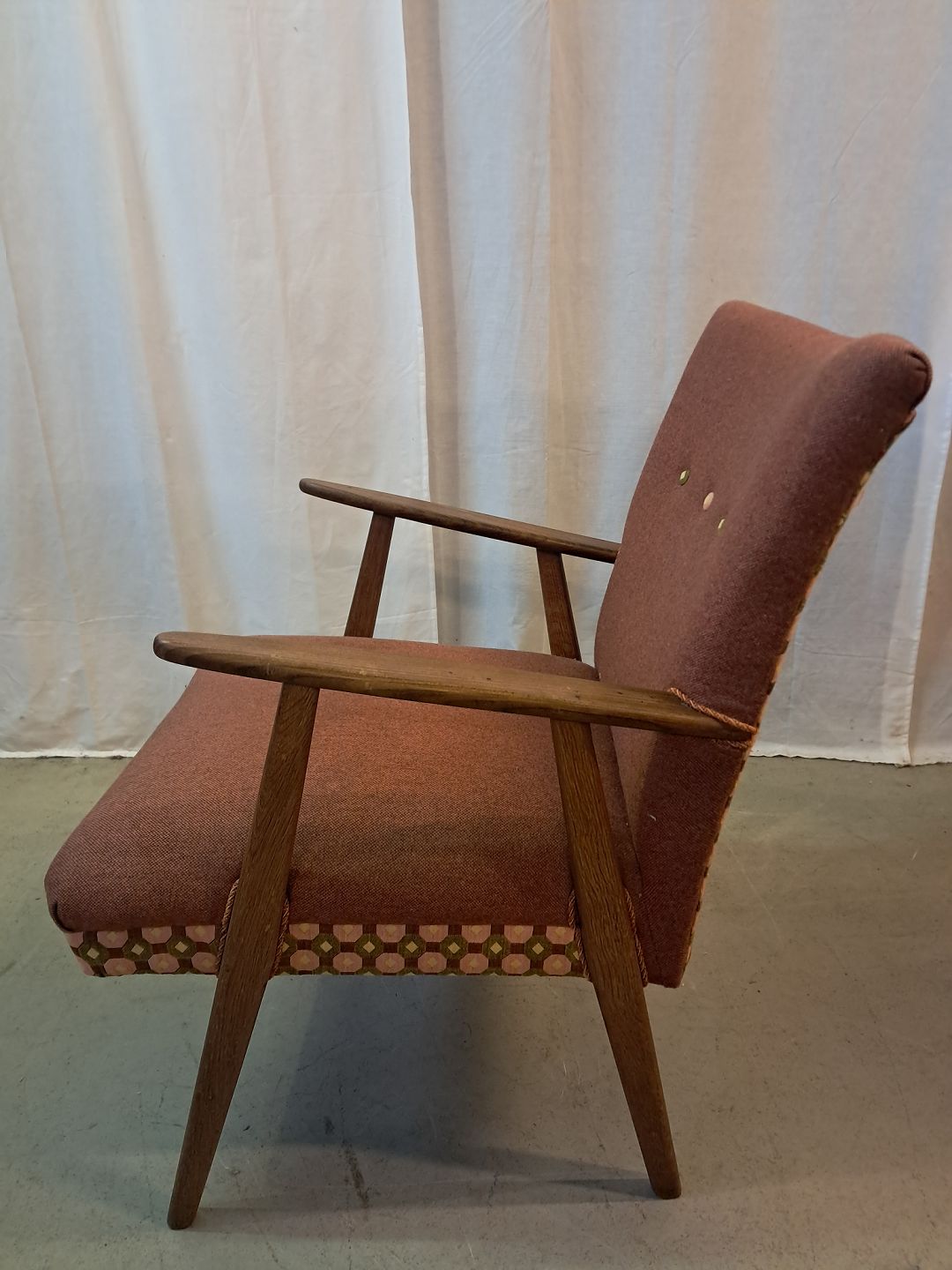 Lænestol i teaktræ med stofbetræk, fra 1960erne.