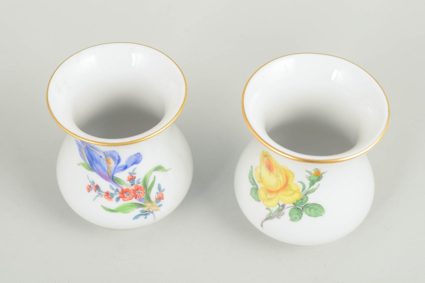 Små balusterformede miniaturevaser i hvidt porcelæn, dekoreret med håndmalede polykrome blomsterbuketter og afsluttet med forgyldt rand. Mærket i bunden med Meissens krydsede sværd.