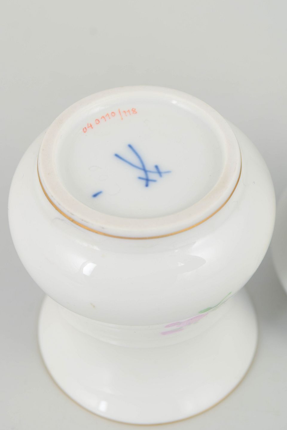 Meissen blev grundlagt i 1710 og er Europas ældste porcelænsmanufaktur. De krydsede sværd, introduceret i 1720’erne, er et af verdens mest kendte porcelænsmærker og fungerer som garanti for oprindelse og kvalitet. I mellemkrigstiden og 1940’erne videreførte Meissens klassiske blomsterdekorationer i miniatureformat, udført med stor teknisk præcision og i tråd med fabrikkens lange tradition for håndmalet porcelæn.