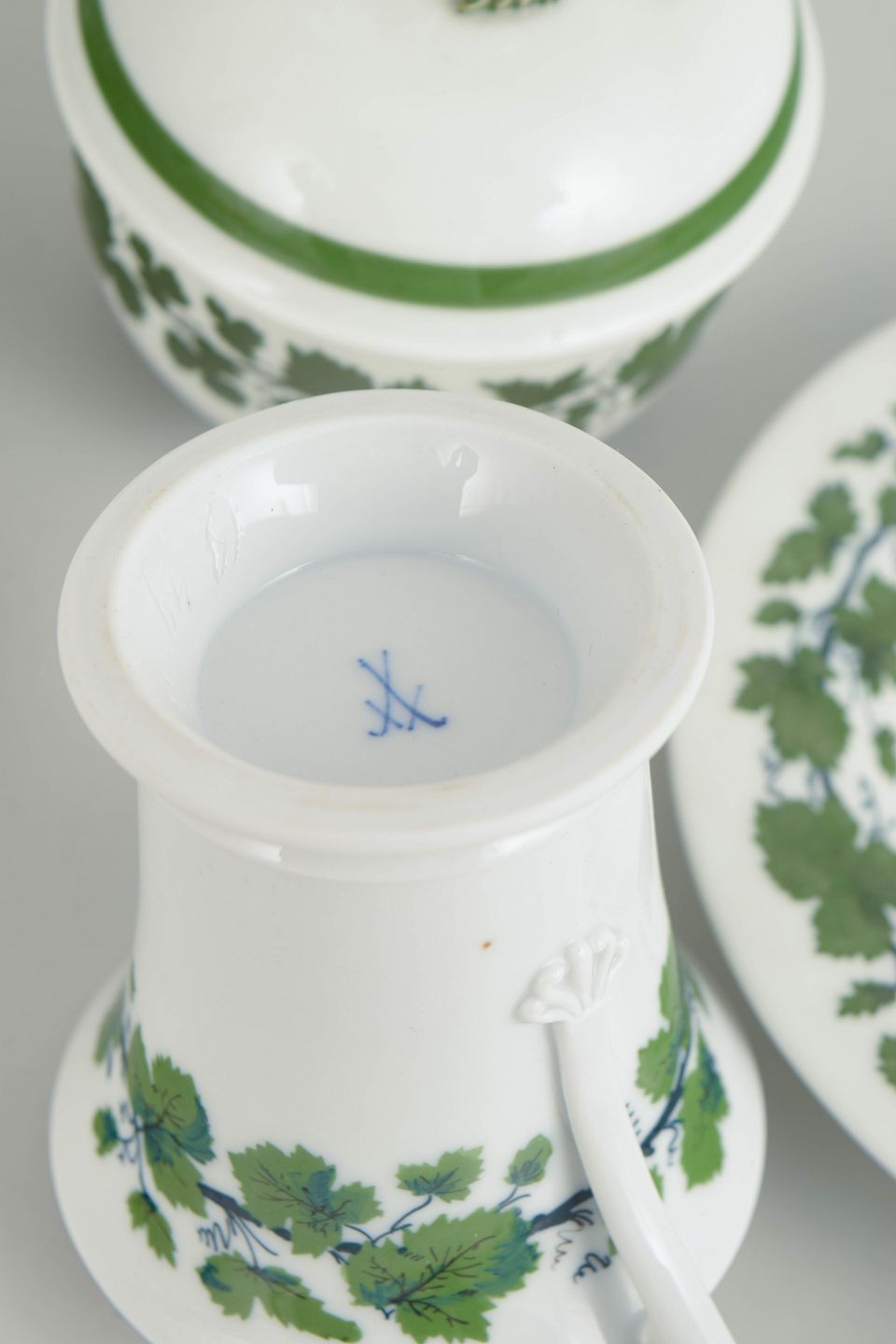Et par kaffekopper med svanehank og tilhørende underkopper samt sukkerskål i porcelæn, dekoreret med grøn vinløvsbort. Nogle dele i første sortering, andre annulleret med to indridsede streger. Mærket med Meissens krydsede sværd.