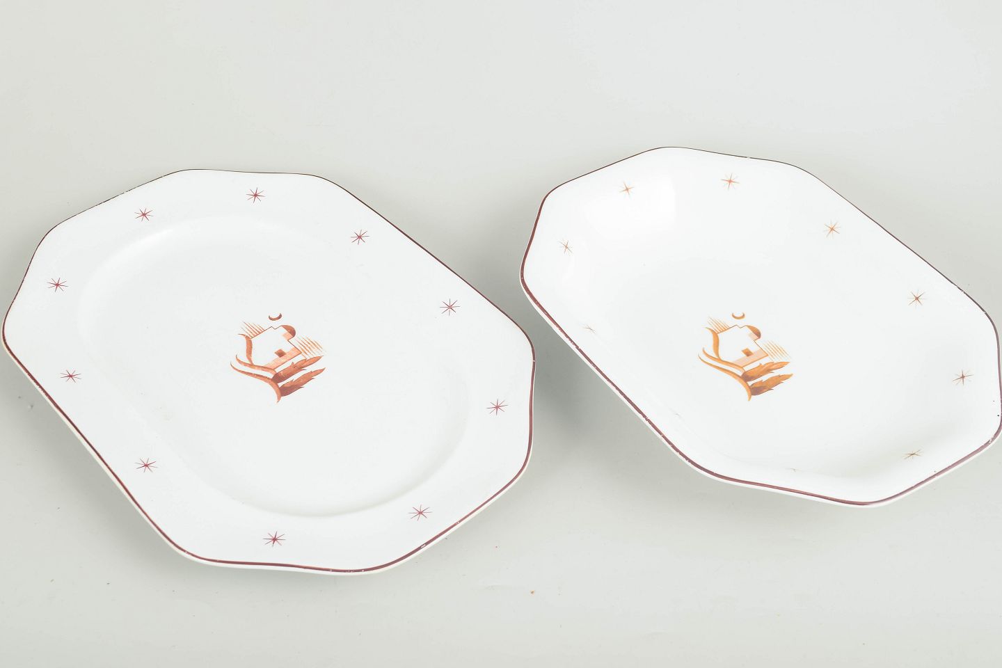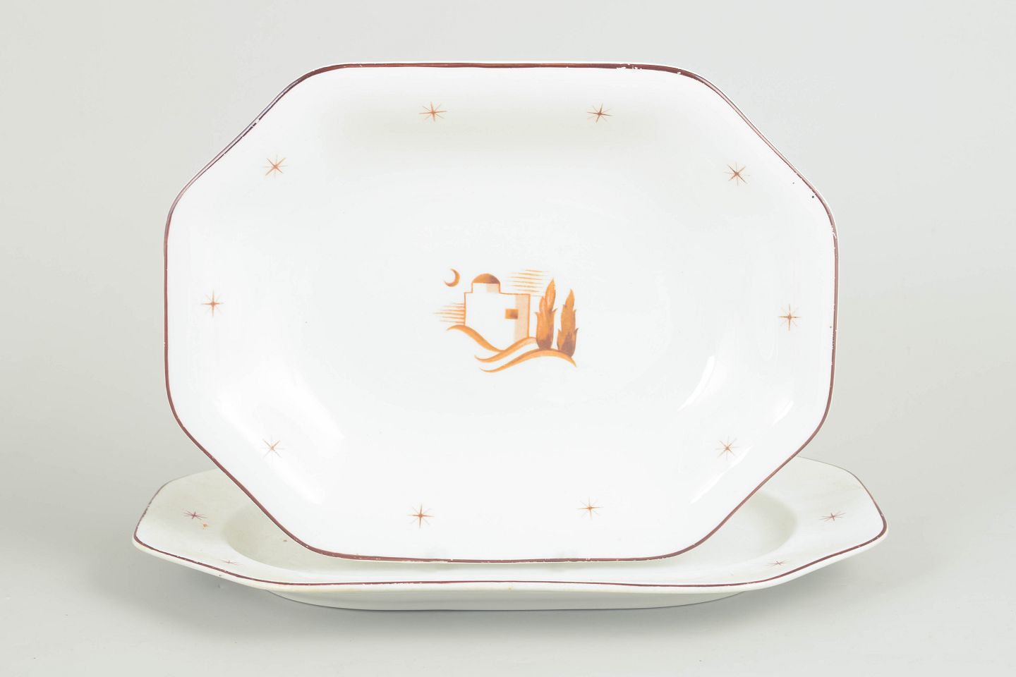 Fade i glaseret fajance med facetteret form, brun kantstreg og stjernemotiver samt centralt orientalsk landskabsmotiv. Model Orient. To fade i nært beslægtede størrelser.
