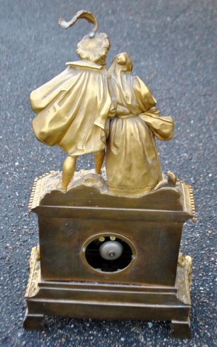 Fransk kaminur i lueforgyldt bronze, 1810 - 1820. Charles X. Uret dekoreret med figurer forestillende en kavaler og en kvinde. Detaljeret kasse. Med hvidemaljeret skive. H.: 70 cm. B.: 39 cm. D.: 14 cm.