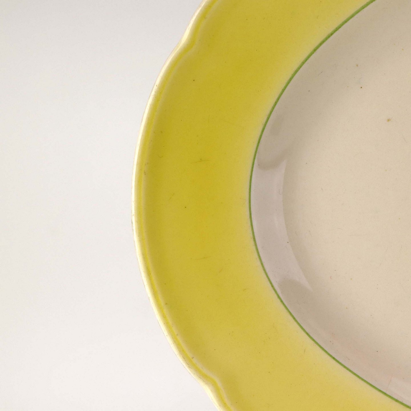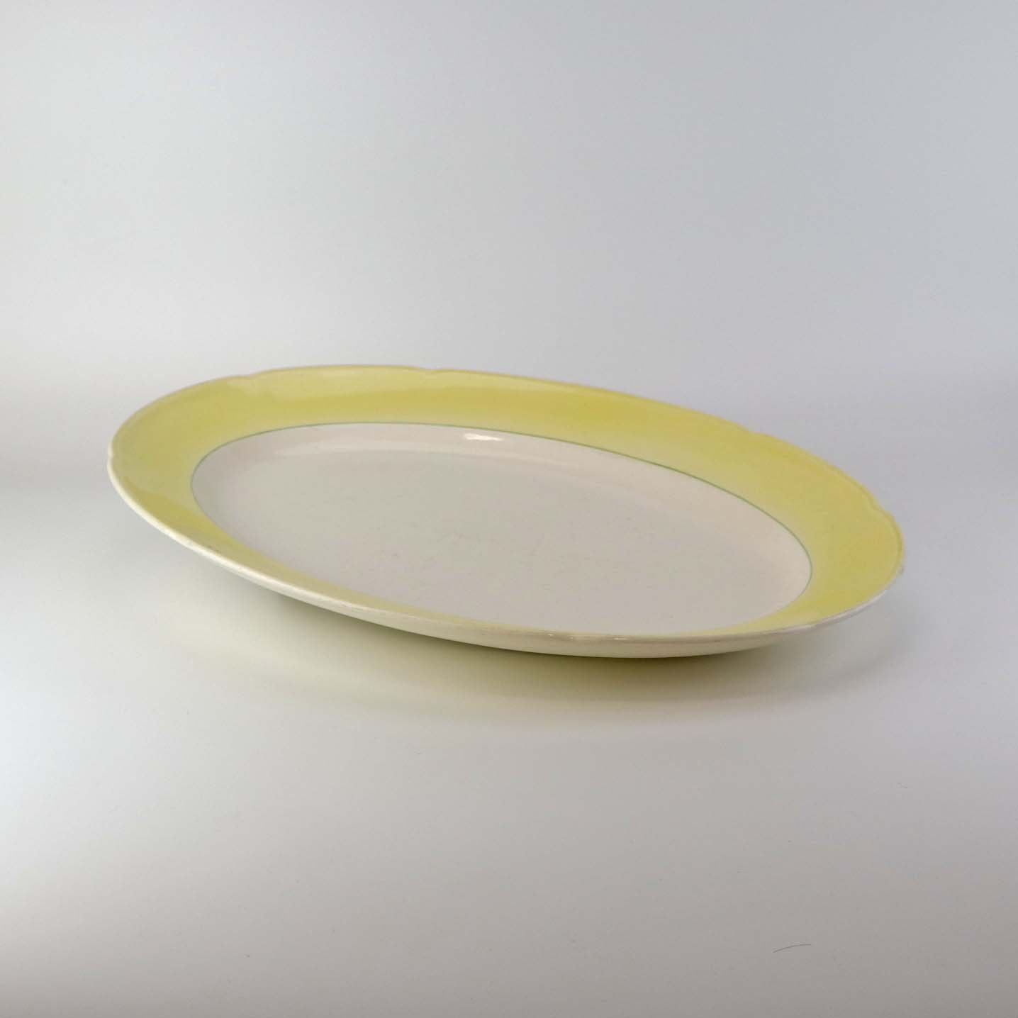 Fajancestel med gul dekoration på lys baggrund og med vissengrøn streg.