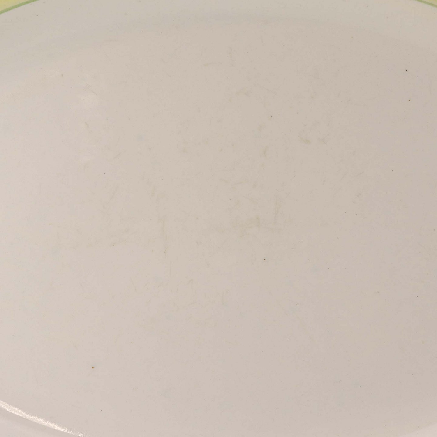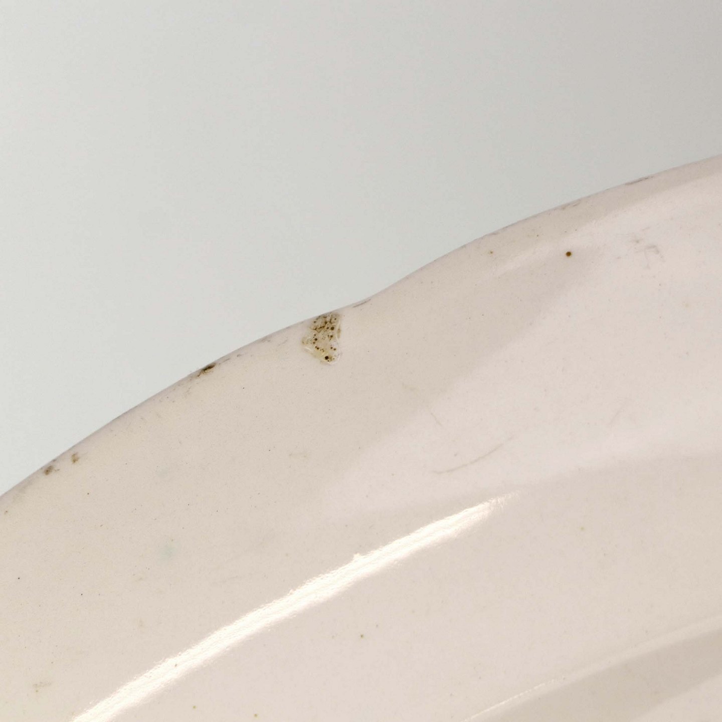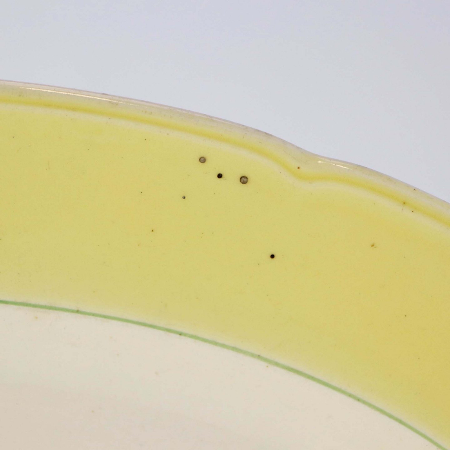 Fremstår med mørkning og ujævnheder i glasuren samt ridser på topsiden af fadet.