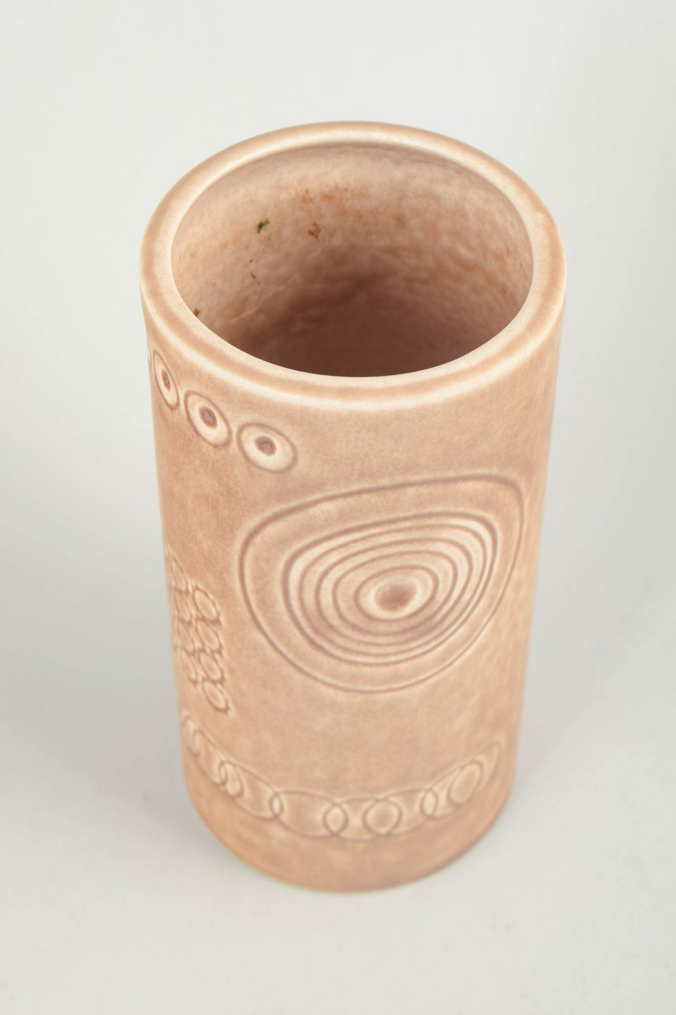 Cylinderformet vase i stentøj med mat, sandfarvet glasur og reliefdekoration med cirkulære og geometriske motiver. Modelnavn “Sarek” angivet i dekorationen.