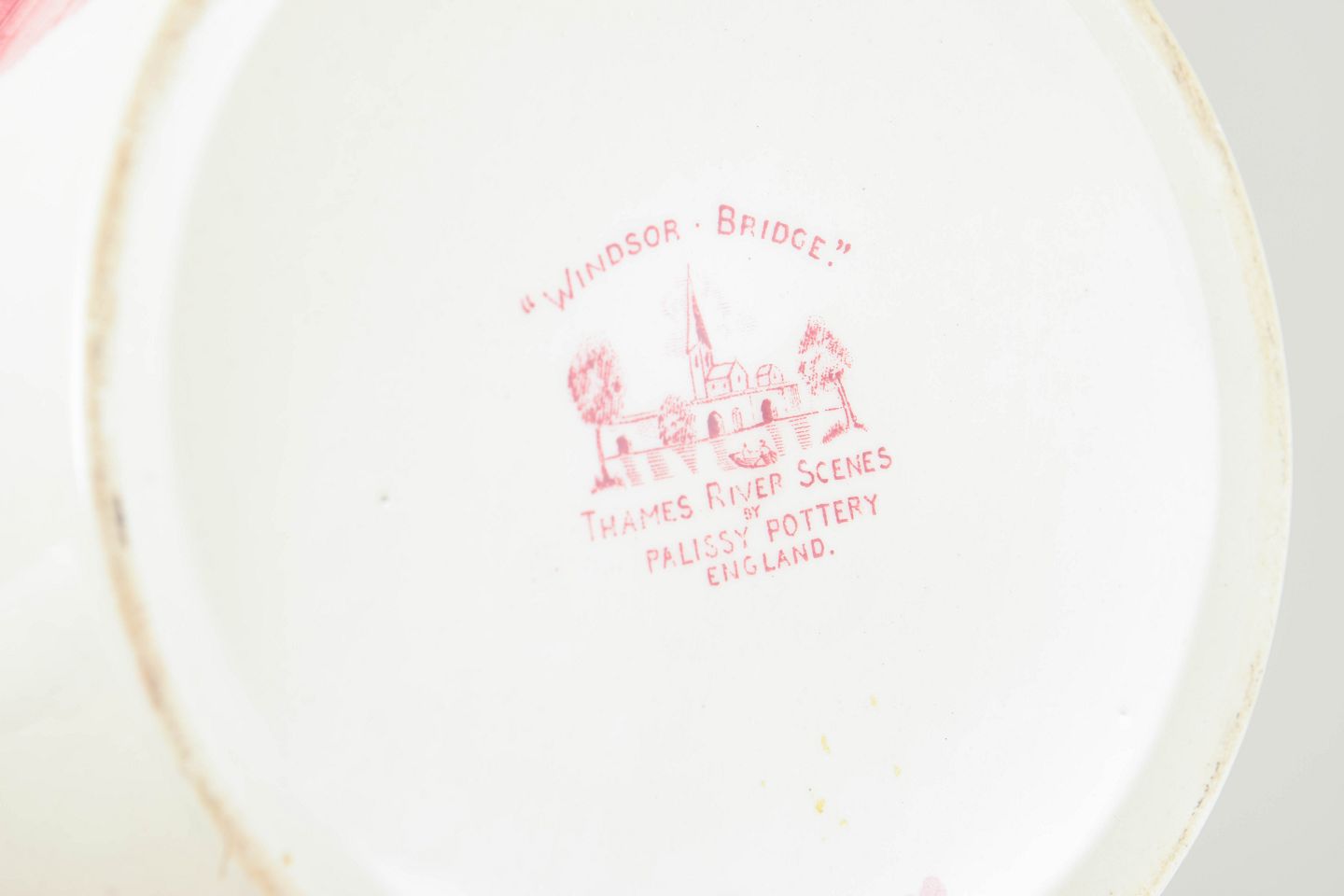Urtepotteskjuler i fajance fra Palissy Pottery, dekoreret i rød transferware med motiv fra Themsen og ornamental bort.