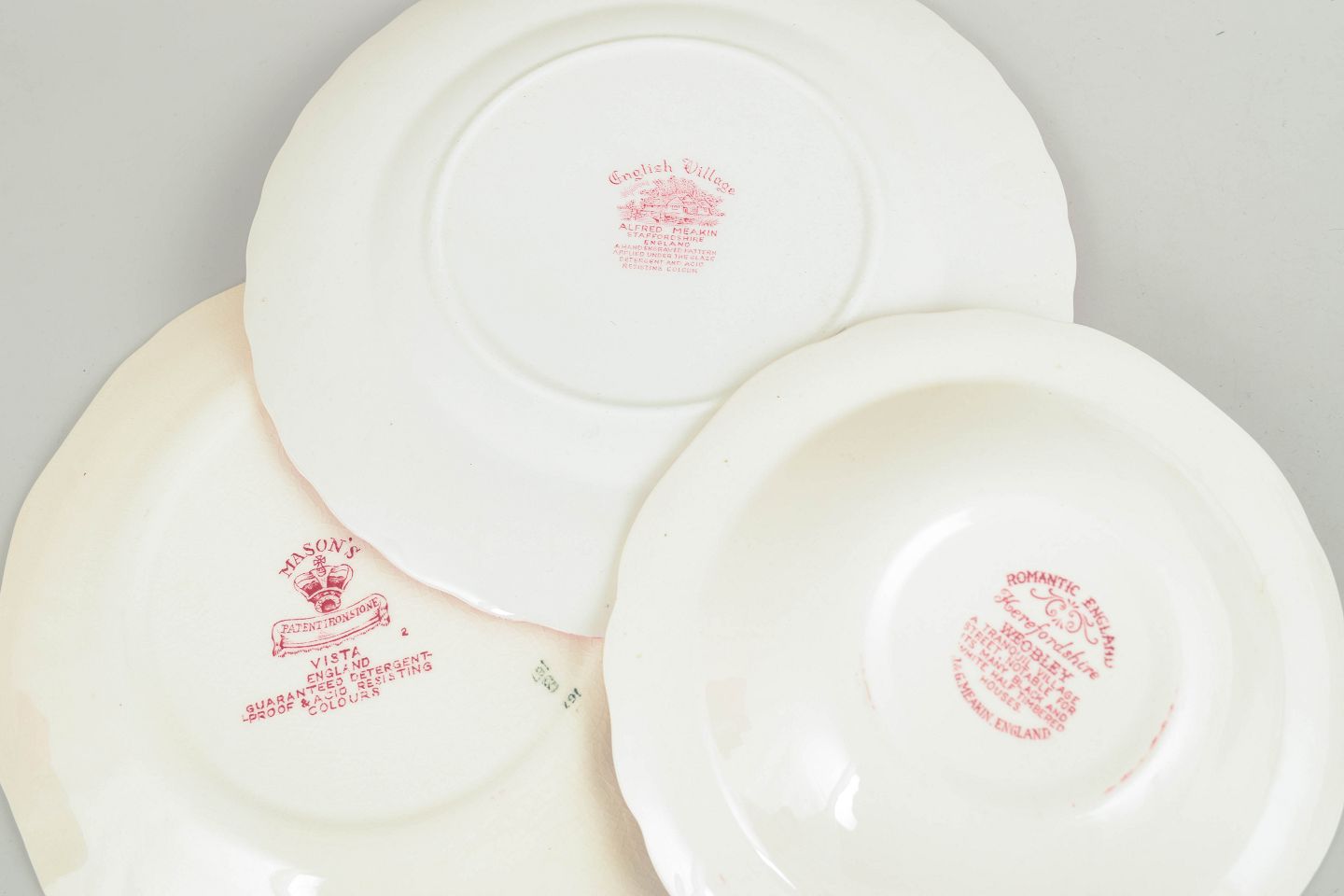 Sæt i fajance bestående af tallerkener og skål, dekoreret i rød transferware med landskabs- og ornamentmotiver fra forskellige engelske producenter, herunder Mason’s.