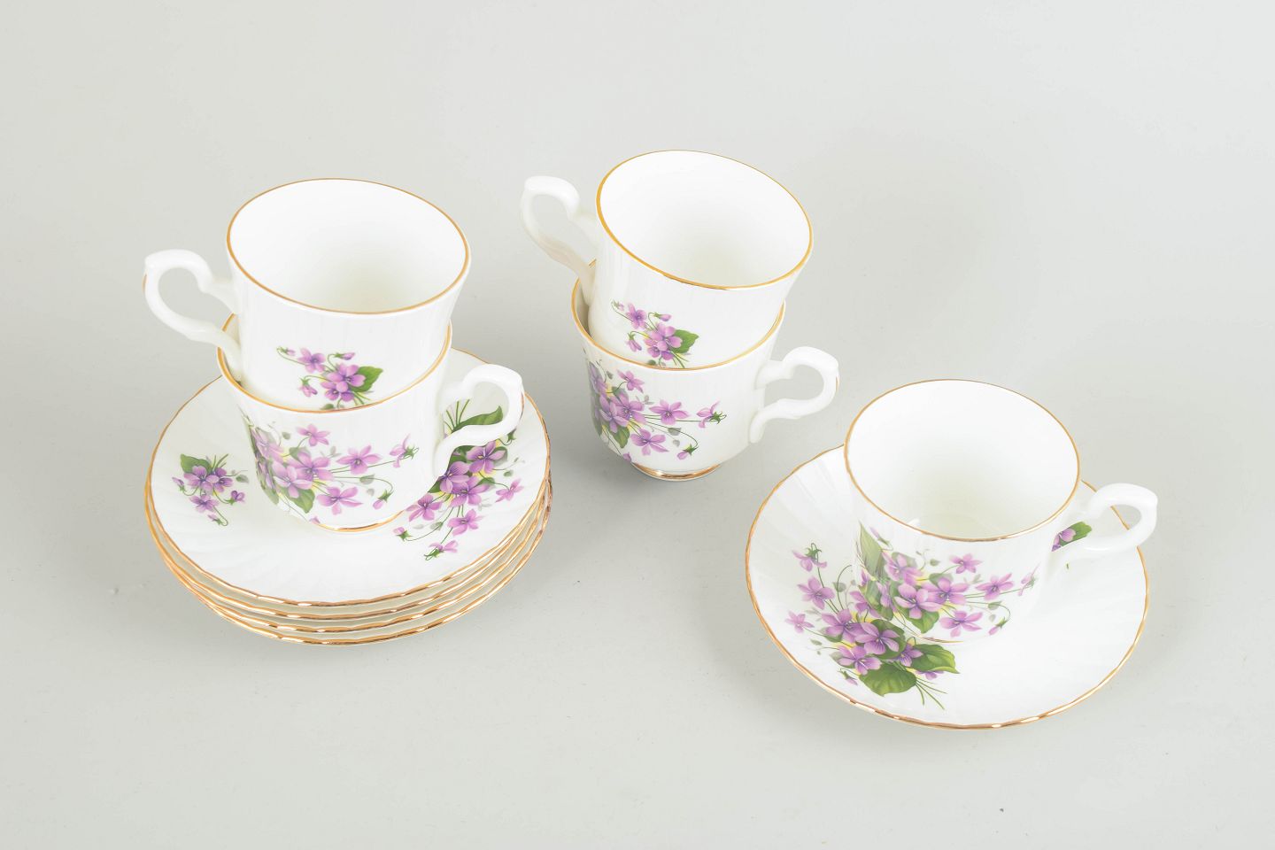 Sæt på fem kaffekopper og tilhørende underkopper i benporcelæn, dekoreret med violette blomster og grønne blade samt guldkant. Fremstillet af Royal Stafford, England.