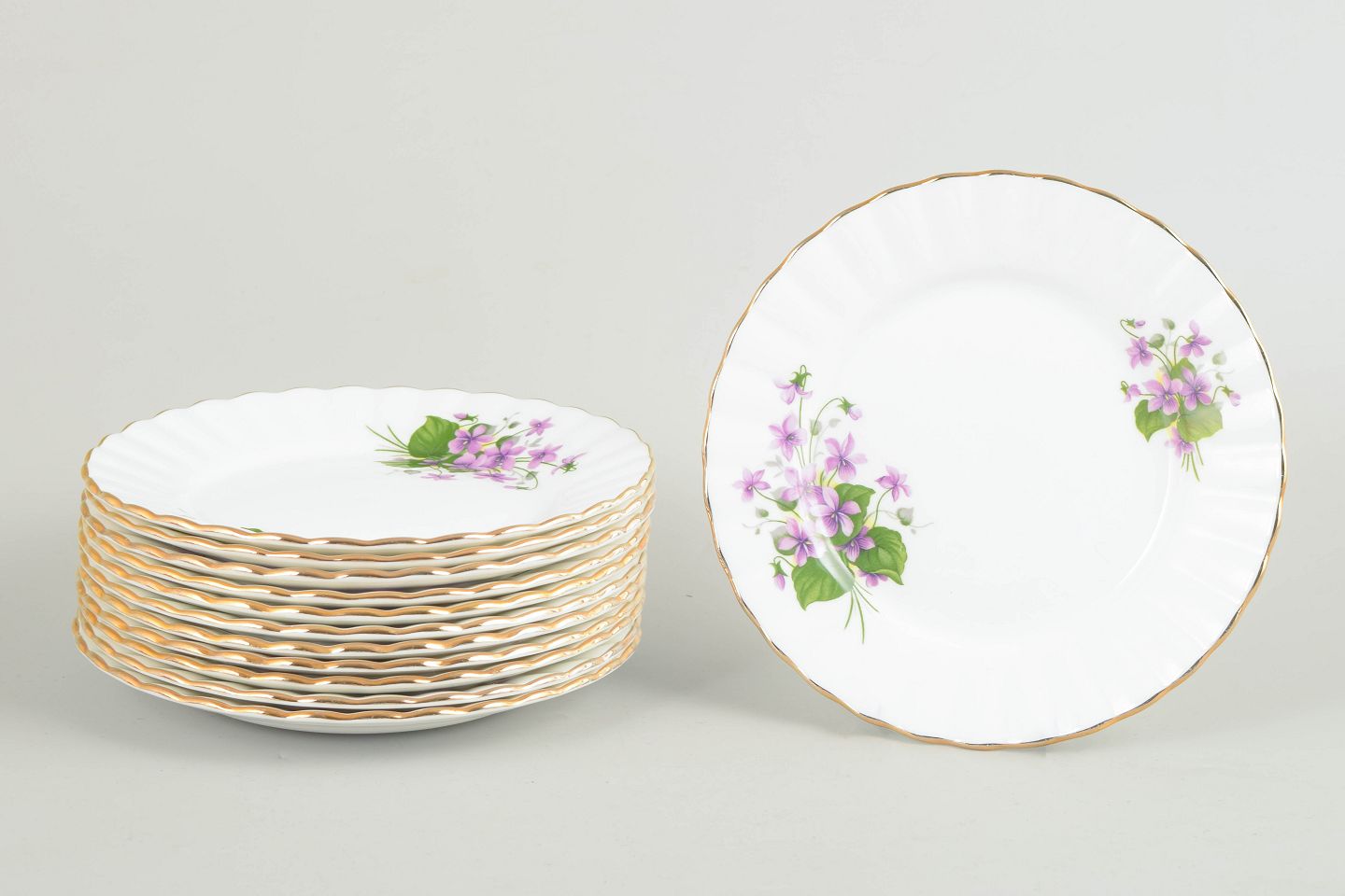 Sæt med tolv kagetallerkener i "bone china", dekoreret med fine lilla blomsterbuketter og forgyldt kant. Klassisk engelsk porcelæn med let relief og elegant, tidstypisk udtryk.