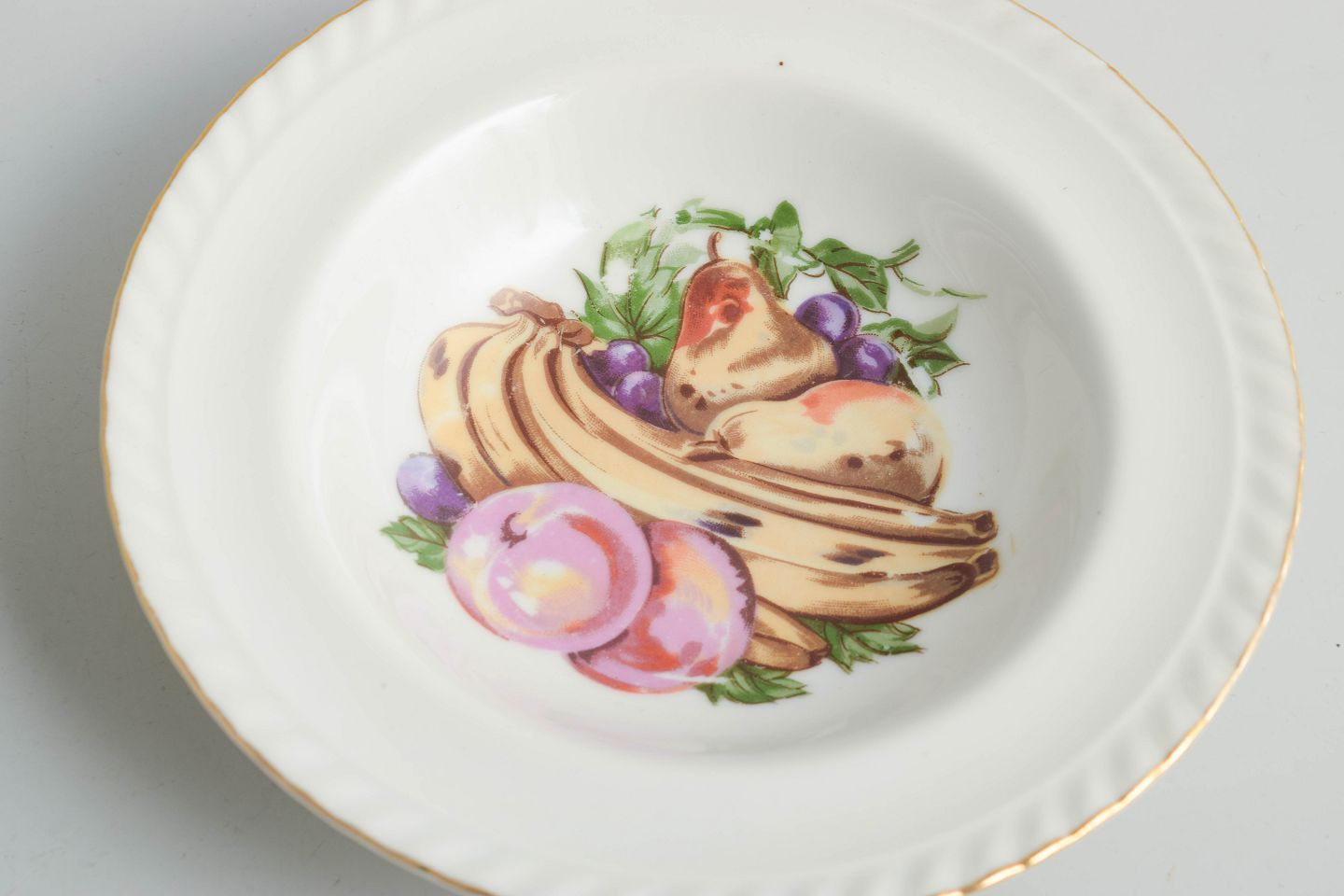 Sæt af seks porcelænsskåle dekoreret med polykrom frugtdekoration og guldkant. Klassisk europæisk bordporcelæn i tidstypisk mellemkrigsstil. Mærket på undersiden.