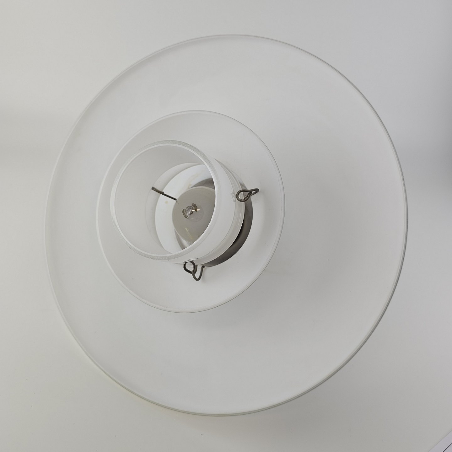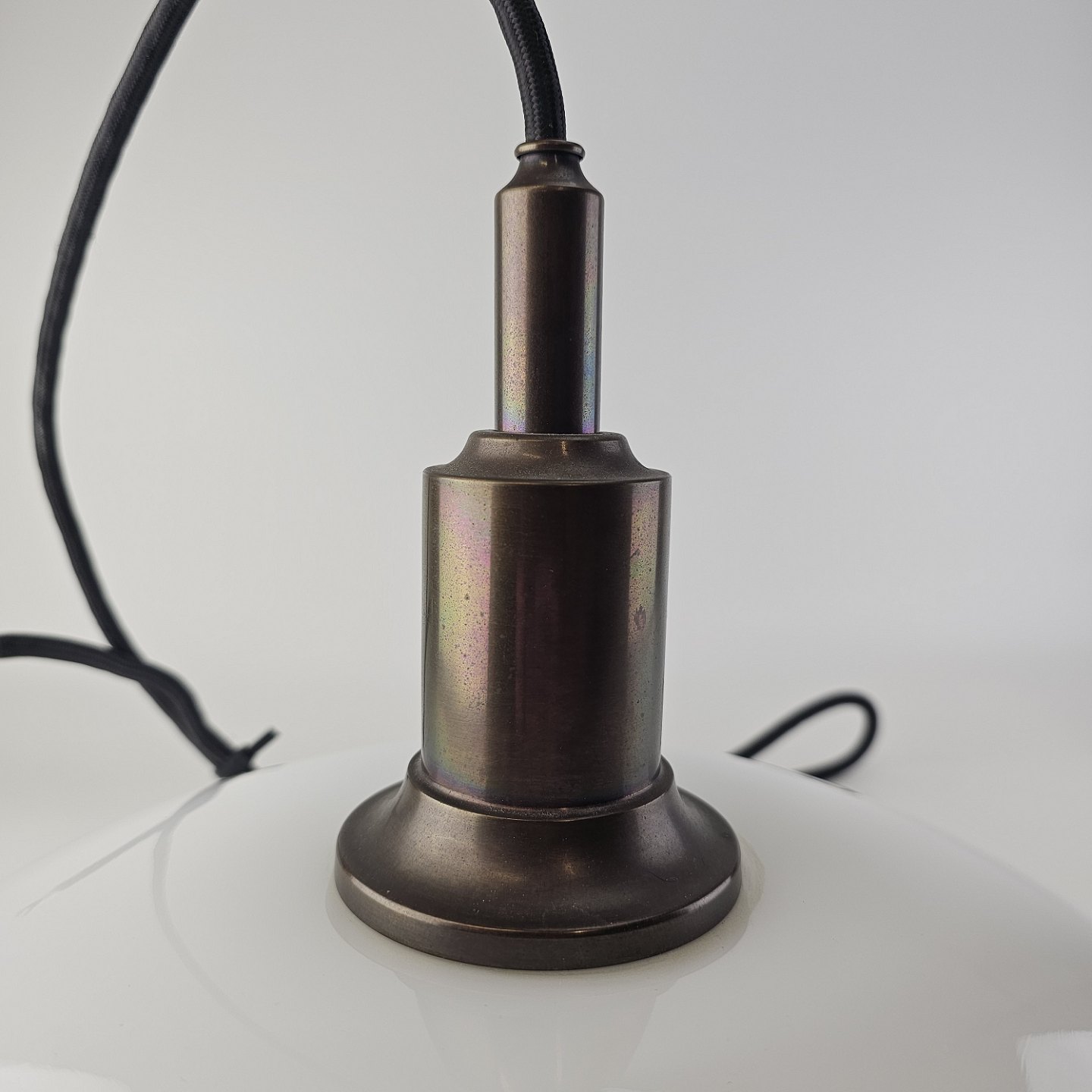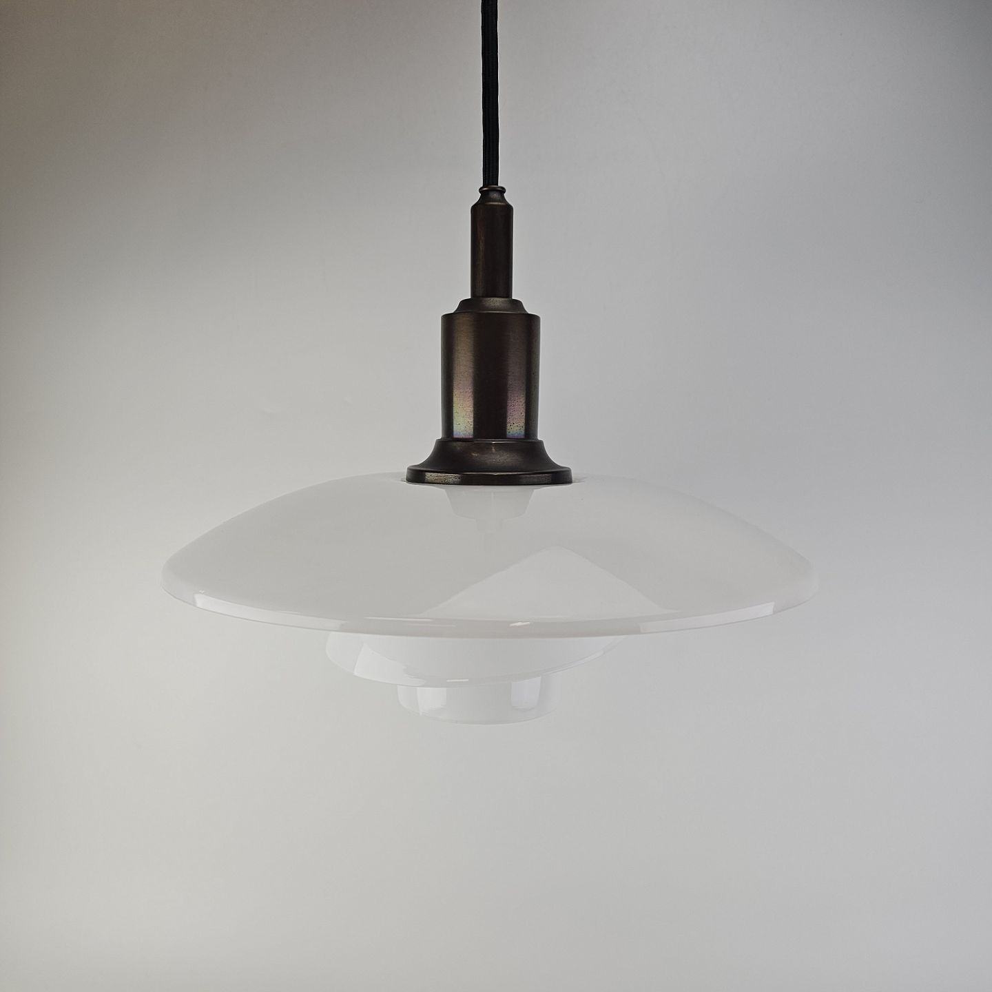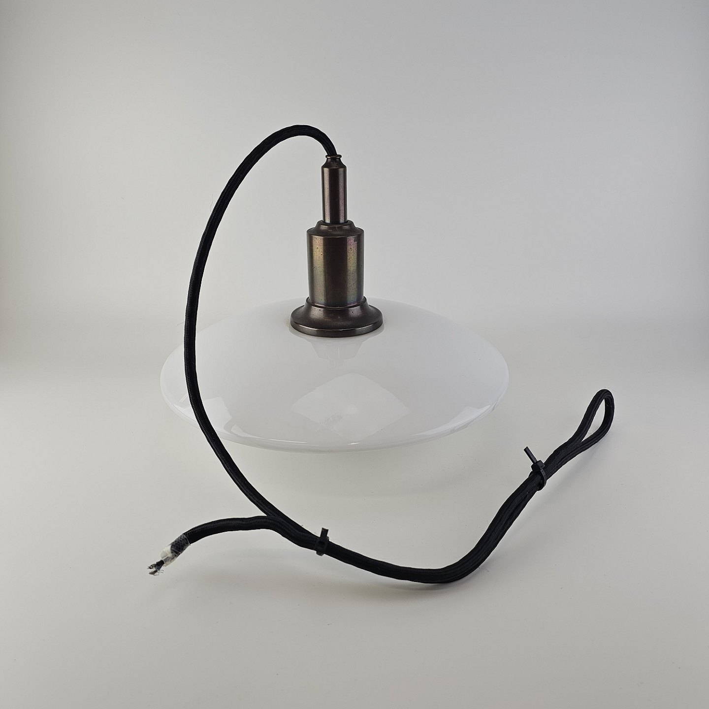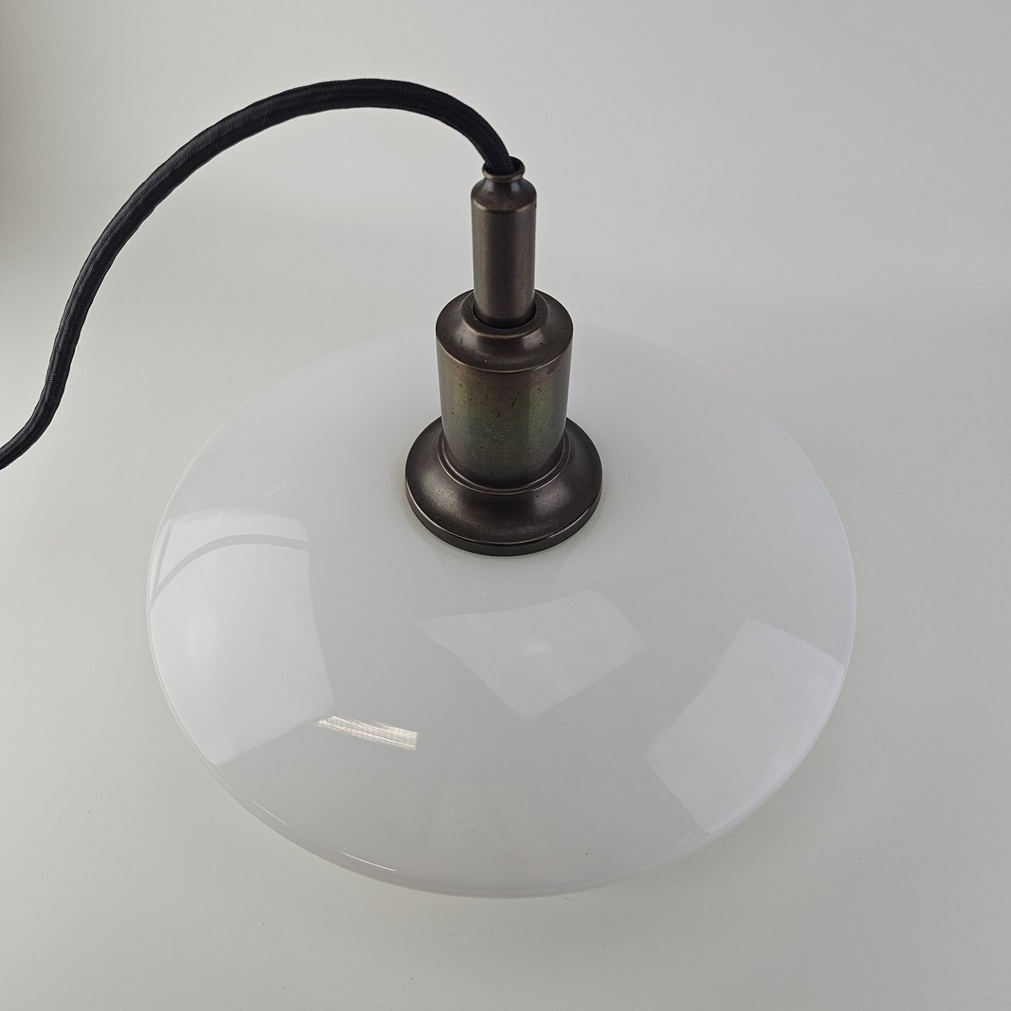 Loftlampe i hvidt opal glas med fatning i bronze