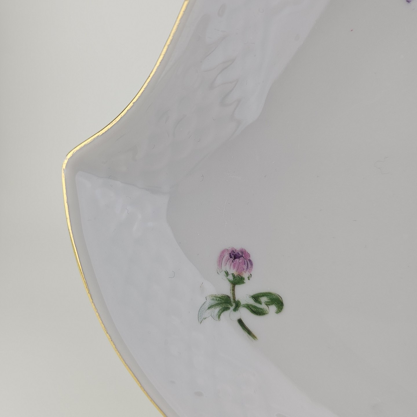 Krysantemum er hvidt porcelæn dekoreret med lys lilla blomst, grønne blade og guldkant.