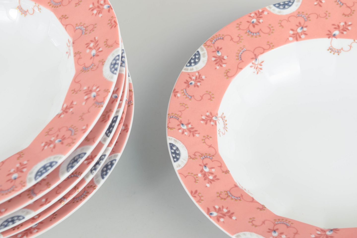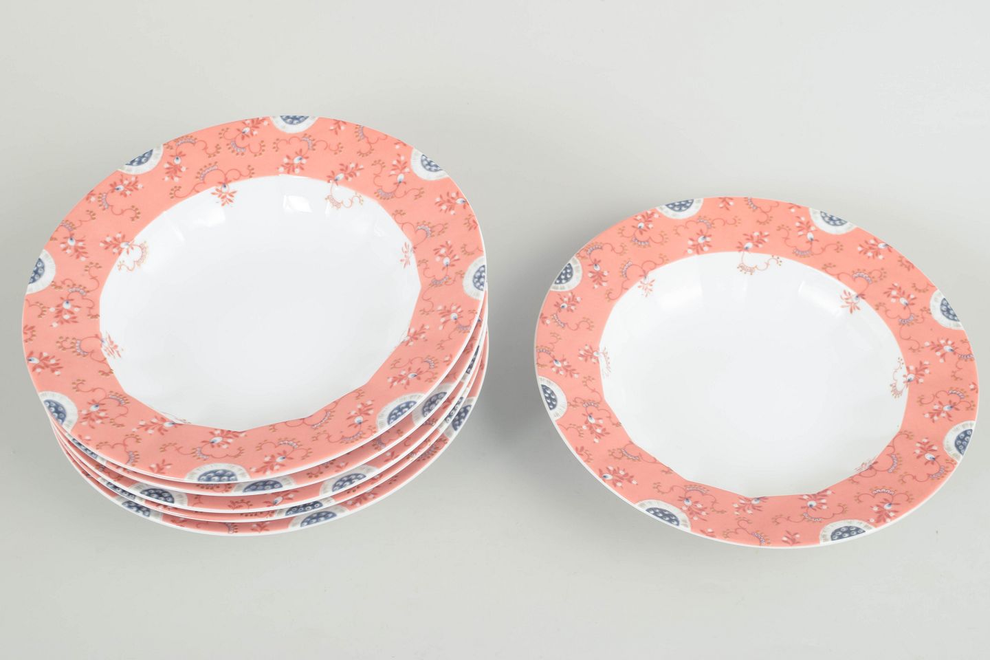 Sæt på seks dybe tallerkener i hvidt porcelæn dekoreret med Fairytale-mønster i bløde rosa toner med fine ornamentale detaljer langs kanten. Fremstillet i perioden 1992–1999 i 1. sortering. Model 604.